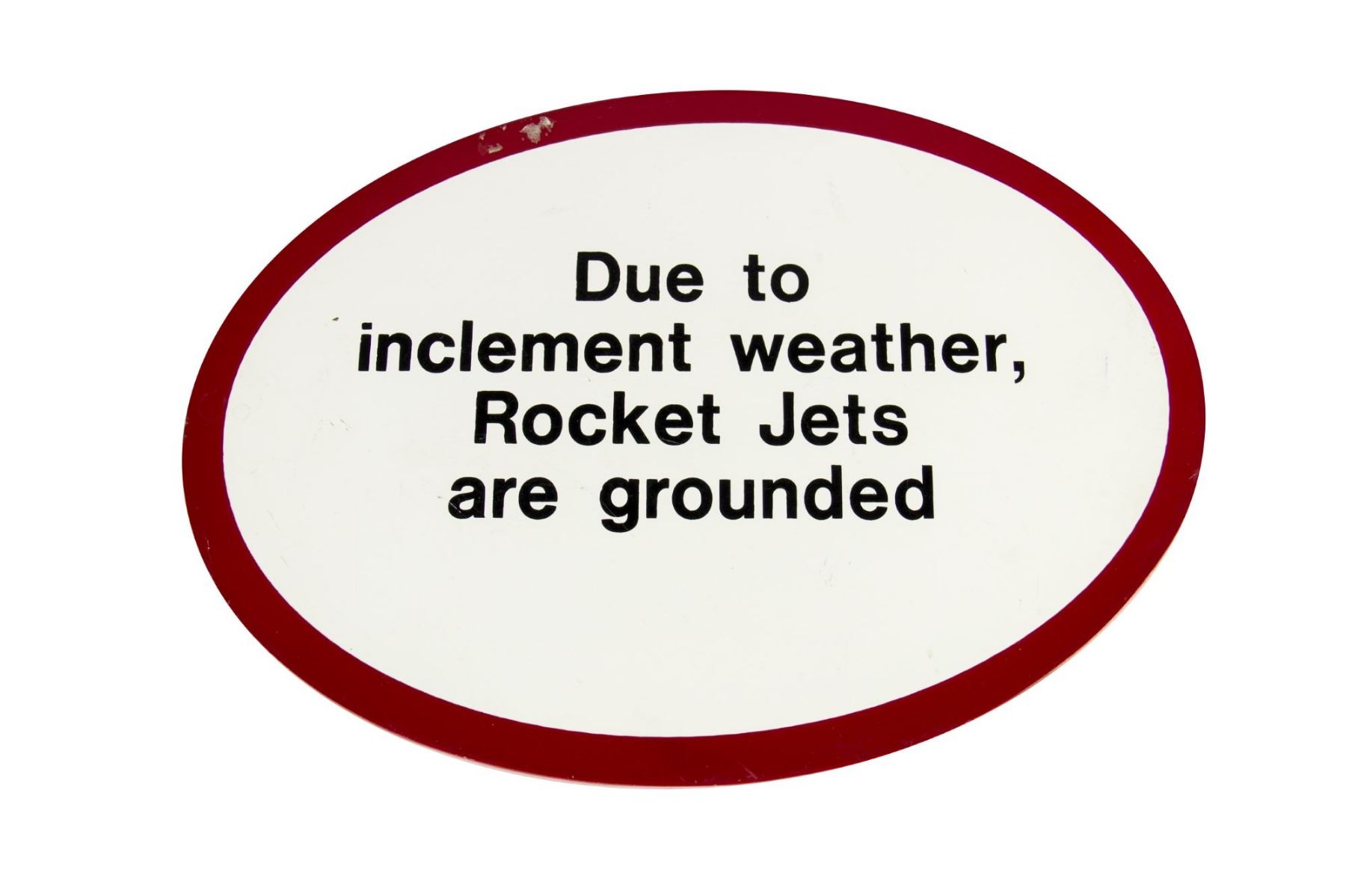 (Disneyland, 1980s) A sign for Disneyland's "Rocket Jets" attraction that was used to inform guests that the attraction is closed. The sign reads, "Due to inclement weather, Rocket Jets are grounded". Accomplished on acrylic board, this sign measures 8.5"x12" and is in very good condition with some scuffing around the border from use.