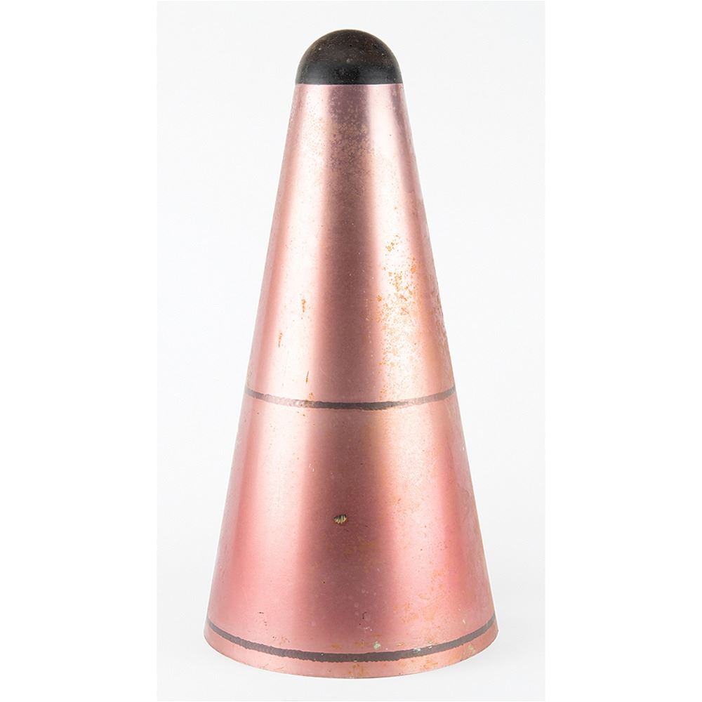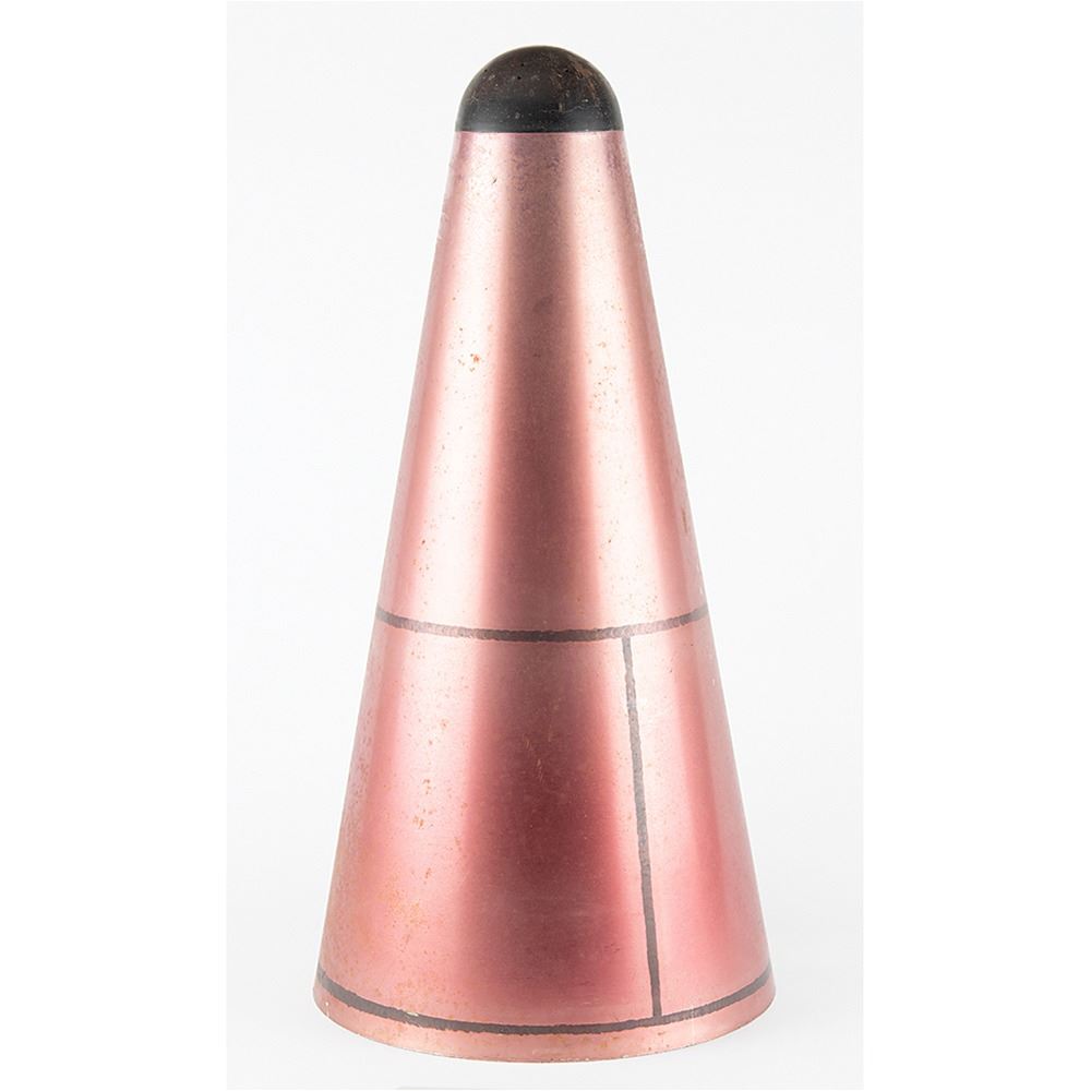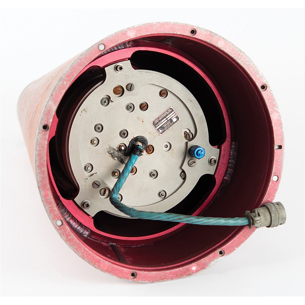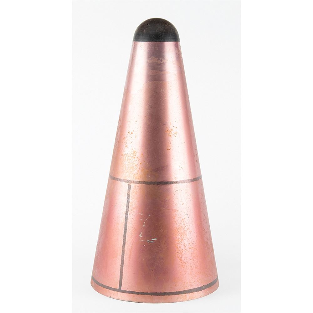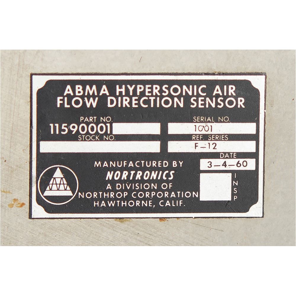 Export restricted (ITAR), sale only to US Citizens and Organizations. Rocket nose cone with built-in hyper-sonic velocity sensor, measuring approximately 23Ë tall and 11.5Ë in diameter across the base, with a Nortronics/Northrop plaque on the base: "ABMA Hypersonic Air Flow Direction Sensor, Part No. 11590001, Serial No. 1001, Ref. Series F-12, Date 3-4-60." The unit retains its cable. The interesting nose cone unit boasts a maroon metallic finish on the exterior. In very good to fine condition.