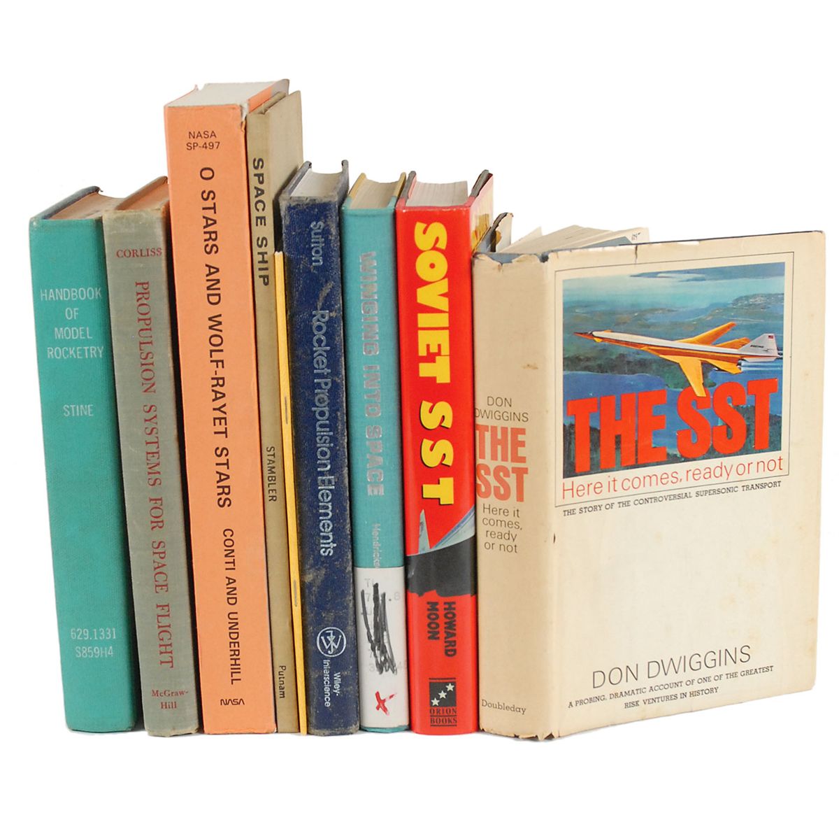 Collection of nine space- and aviation-related books and manuals. Titles include: 0 Stars and Wolf-Rayet Stars; Space Ship: The Story of the X-15; Soviet SST; Rocket Propulsion Elements; Propulsion Systems for Space Flight; and Handbook of Model Rocketry. In very good condition.