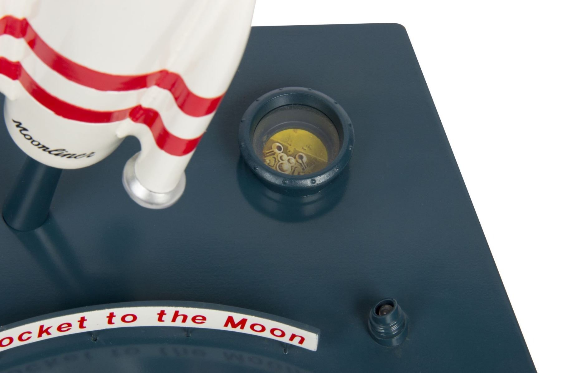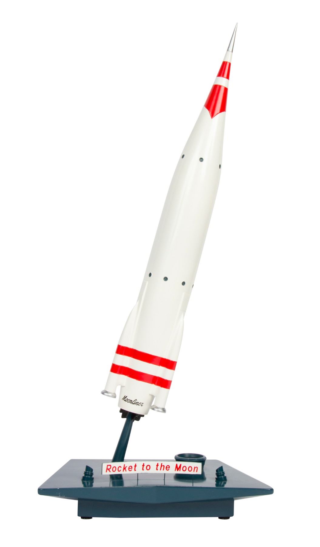 (Disneyland, 2011) A beautiful limited edition replica of the Disneyland "Moonliner" rocket from Tomorrowland, that was created by Kevin Kidney and Jody Daily. Produced in an edition size of only 500 pieces, this model was constructed with lighting built into the base and a small "viewport screen" recessed into the base that contains a color-slide of the spaceport. These details replicate what would be seen in the attraction during take-off. The model measures 21" tall and is in very good condition with minor wear from use. The original box has is beginning to separate due to a flaw in the adhesive used to make the boxes.