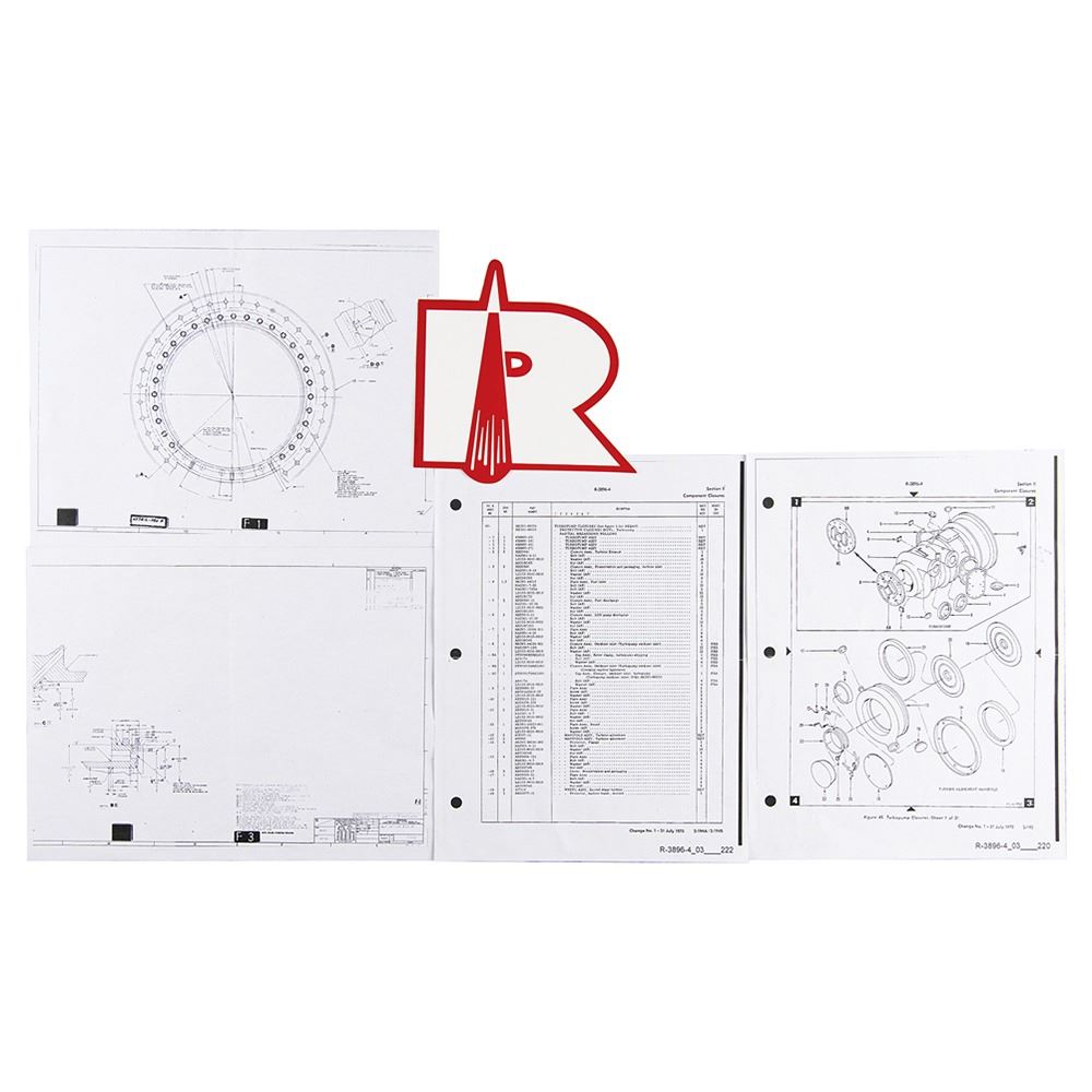 Protective closure assembly for the Rocketdyne F-1 rocket engine's turbopump oxidizer inlet, measuring 18.5Ë in diameter, marked with part no. "RX-20633-25H." Includes an unused 6Ë Rocketdyne decal and a parts list and diagram showing the location of the closure on the F-1 engine; its purpose was to provide better protection and reduce the possibility of foreign objects entering it during handling and use. The F-1, used to power the S-IC first stage of the Saturn V launch vehicle, remains the most powerful single combustion chamber liquid-propellant rocket engine ever developed. In fine condition.