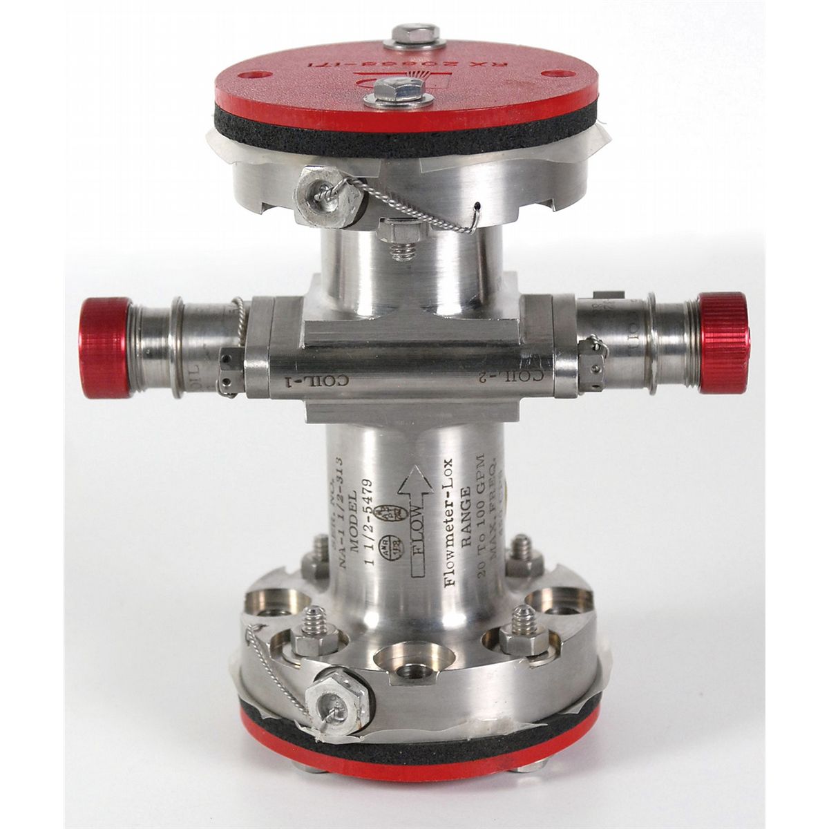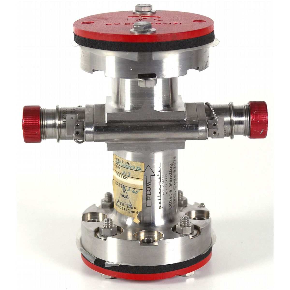 Pristine Rocketdyne F-1 Engine LOX Flow Meter, measuring approximately 6.75? high, milled from a single billet of stainless steel. Meter, serial no. NA-1 1/2-313, retains all of its covers with the seals intact. Meter retains its original NASA inspection label, dated in a technician’s hand “8-3-65.” In fine, bright condition. An uncommon relic as less than 100 engines were built, with most having been flown.
