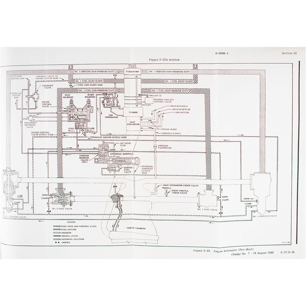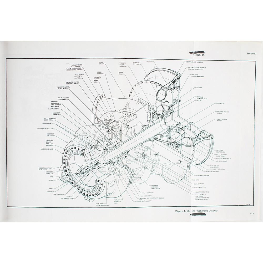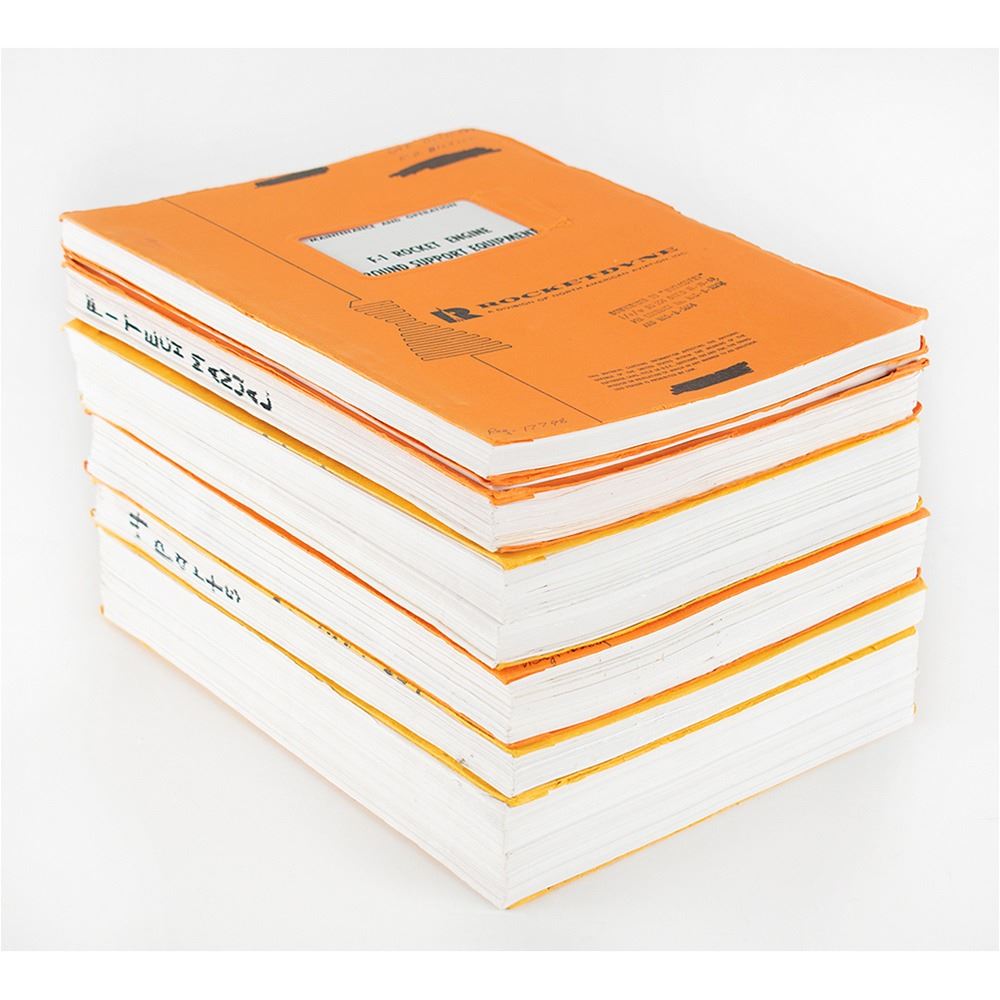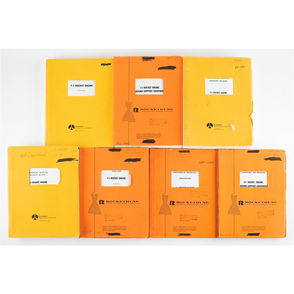Nine volumes of Rocketdyne technical manuals for the F-1 rocket engine, totaling approximately 1,400 pages of detailed diagrams, schematics, instructions, tables, and descriptions pertaining to the F-1, which was used to power the S-IC first stage of the Saturn V launch vehicle. The F-1 remains the most powerful single combustion chamber liquid-propellant rocket engine ever developed. Titles include: