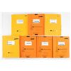 Four are in orange "Rocketdyne/North American Aviation" wrappers, three are in yellow "Rocketdyne/North American Rockwell" wrappers, and two are in modern white binders. Three of the orange manuals are stamped "Downgraded to 'Unclassified'‰Û_per contract No. NAS-8-18734 and NAS-8-5604."