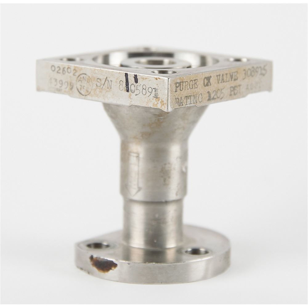 A 1970 hot-fire F-1 Engine Gas Generator Purge Check Valve Body, 2.5è x 2è x 2è, with various part numbers and a North American Rockwell acceptance stamp: ‰ÛÏPurge CK Valve 308915, Rating 1205 PSI, Assy.‰Û