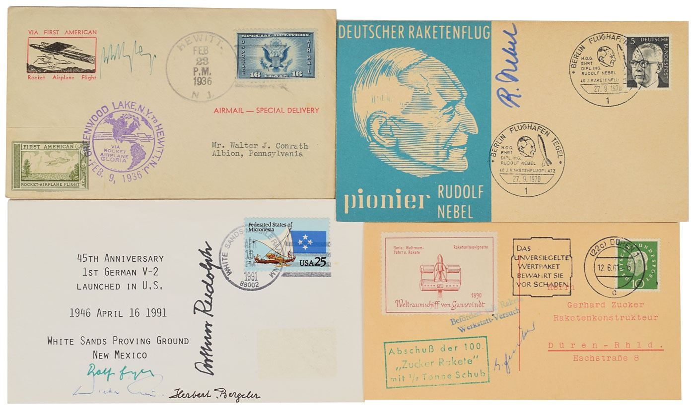 Four signed postal covers: an airmail envelope with a cachet honoring the first American rocket airplane flight, postmarked Hewitt, New Jersey, February 23, 1936, signed in black ink by Willy Ley; a German postcard signed in blue ballpoint by Gerhard Zucker; a color German postcard with a cachet honoring Rudolf Nebel, vertically signed in blue felt tip by Nebel; and a mailing envelope with text honoring the 45th anniversary of the first German V-2 launched in the US, signed in various ink types by Arthur Rudolph, Rolf Engel, Dieter Grau, and Herbert Bergeler. In overall fine condition, with evidence of label removal to V-2 envelope. From the collection of aerospace memorabilia specialist Ken Havekotte.