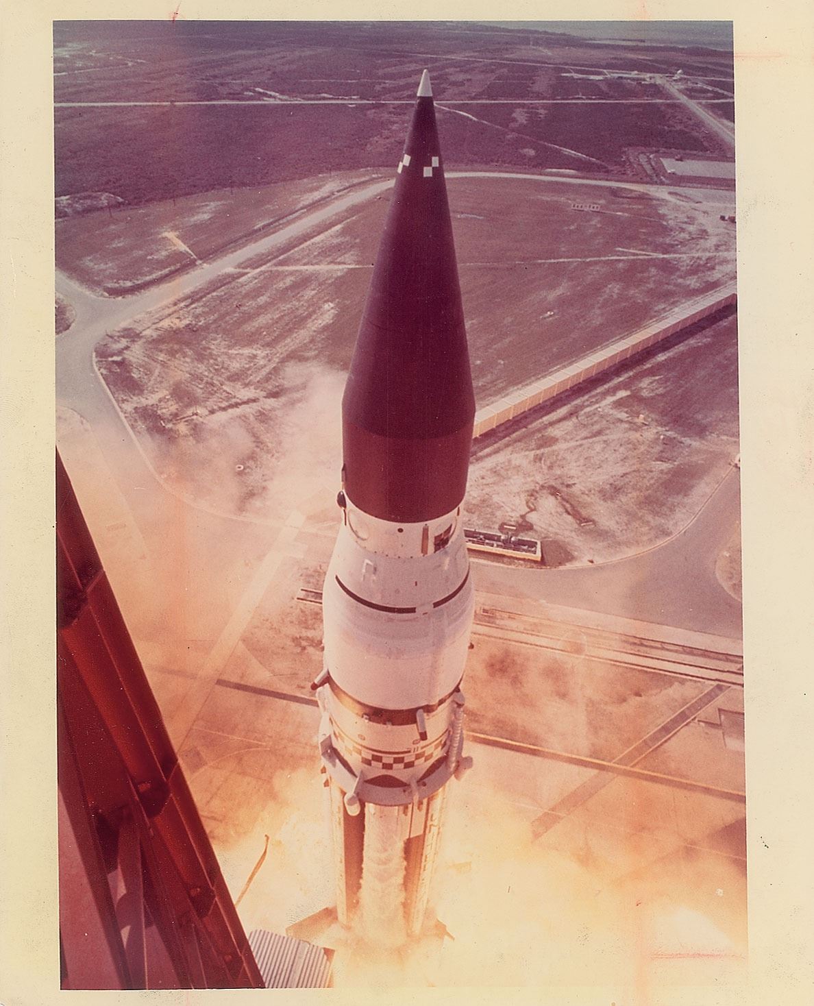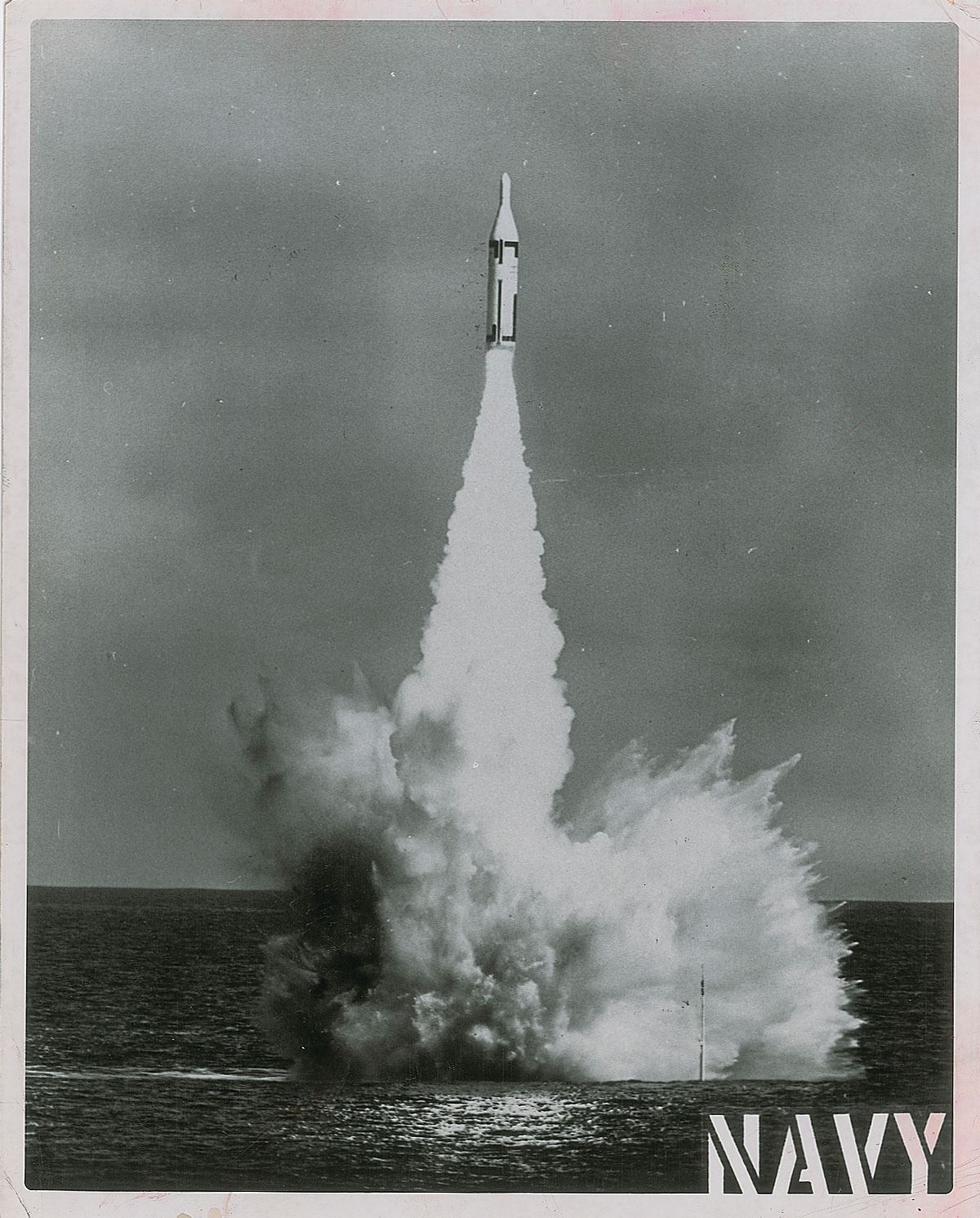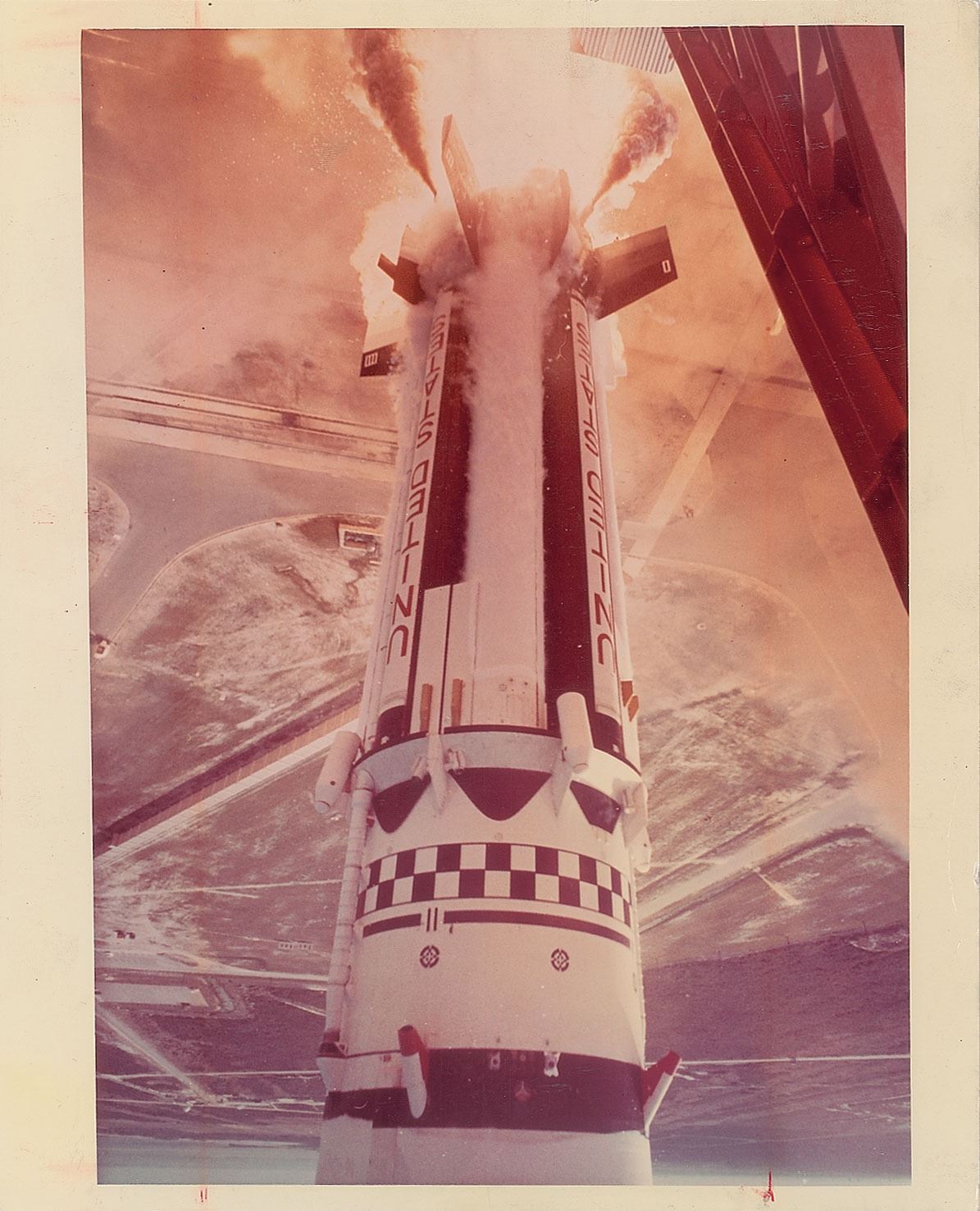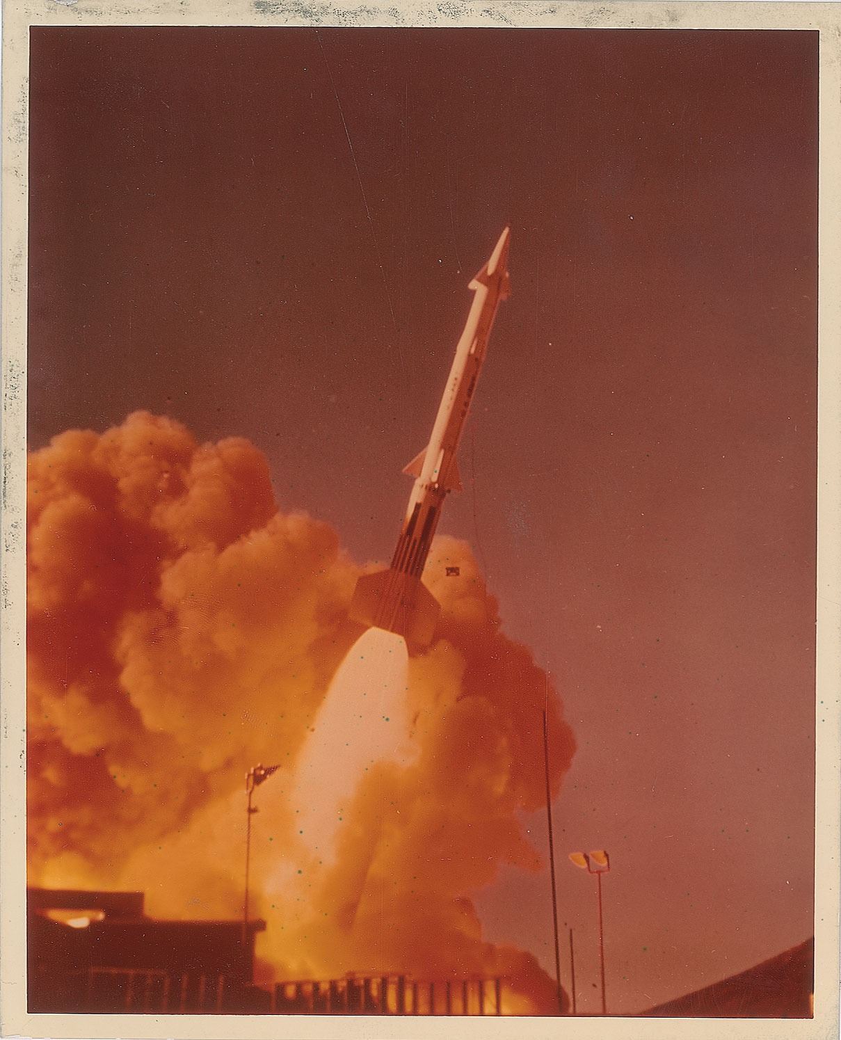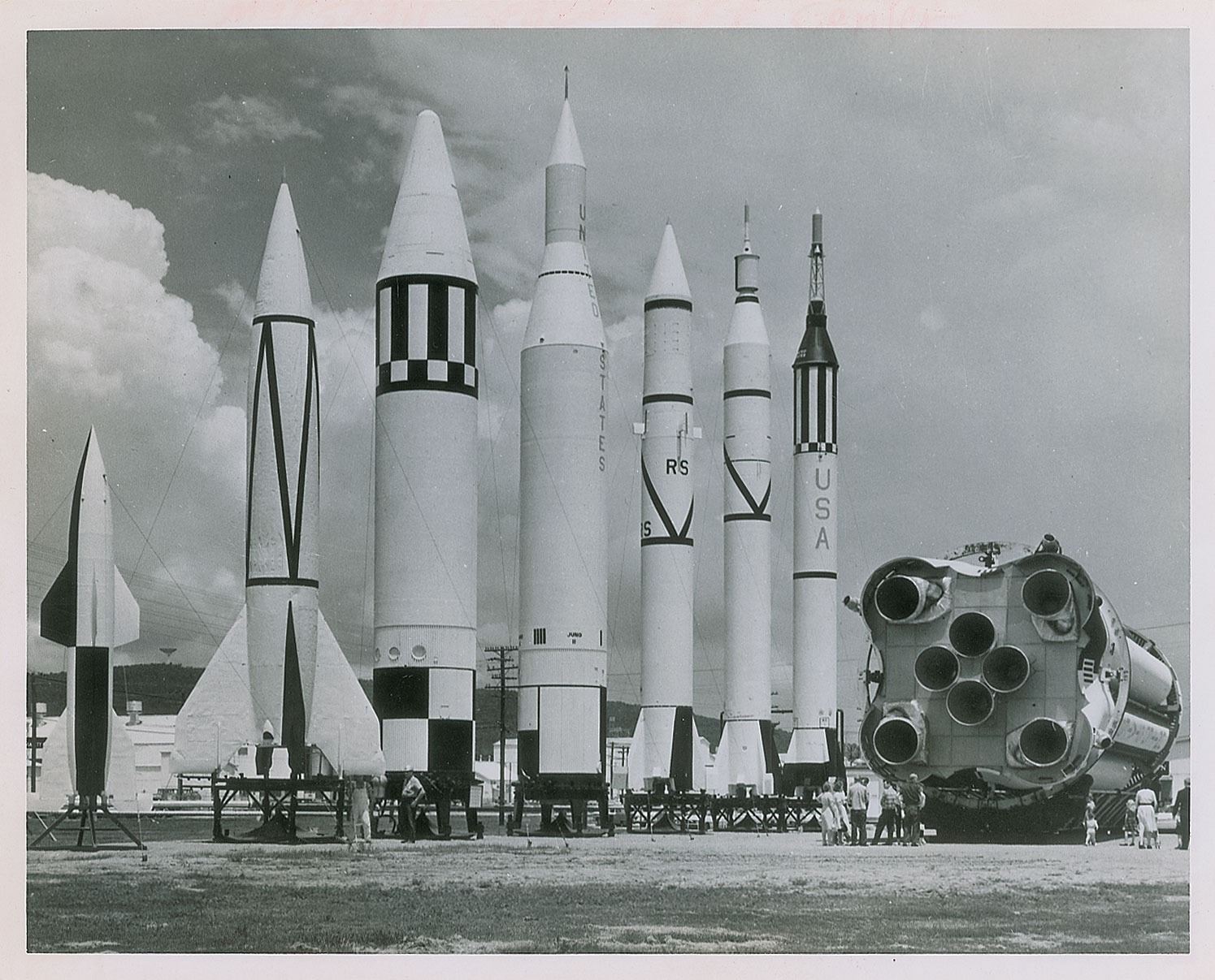 Image subjects include: an attempted Titan launch at the Patrick AFB in December 1959; an Atlas-Centaur launching with the Intelsat IV communications satellite from Cape Kennedy in January 1971; a rocket lineup consisting of the Hermes, Jupiter, Juno II, Redstone, Jupiter-C, Mercury-Redstone, and the Saturn I booster; the liftoff of a Little Joe booster from Wallops Station, Virginia; the successful submarine launch of a Polaris test vehicle in July 1960; the fiery launch of the Army’s Nike Zeus missile from the White Sands Missile Range in December 1960; the launch of the Army’s Nike Hercules missile from White Sands in February 1961; the ascension of the Titan II rocket at Cape Canaveral in March 1962; a sequential hour-by-hour rollout of the Apollo 4 Saturn V launch vehicle; the liftoff of the Atlas-D rocket in May 1965, and many more. In overall fine condition, with some creases, small tears, and wear to edges, and some editorial notations to image sides.