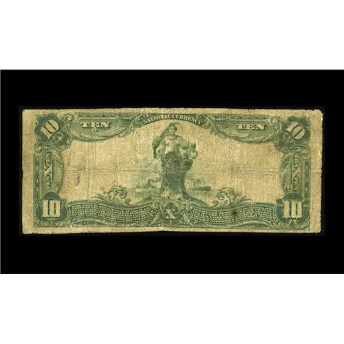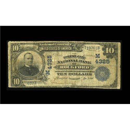 <B>Rockford, IL</B></I> - $10 1902 Plain Back Fr. 627 <B>The Forest City NB</B></I> Ch. # (M)4325<BR>This strongly collected locale had no less than 12 issuers. This is one of the more elusive, with a published Kelly census of only seven survivors in large. Interestingly, of the dozen banks to receive a federal charter here, no less than eight failed prior to the close of the note issuing era. This was one of them, closing its doors forever in April of 1932. Tonight's example grades <B>Very Good.</B></I>
