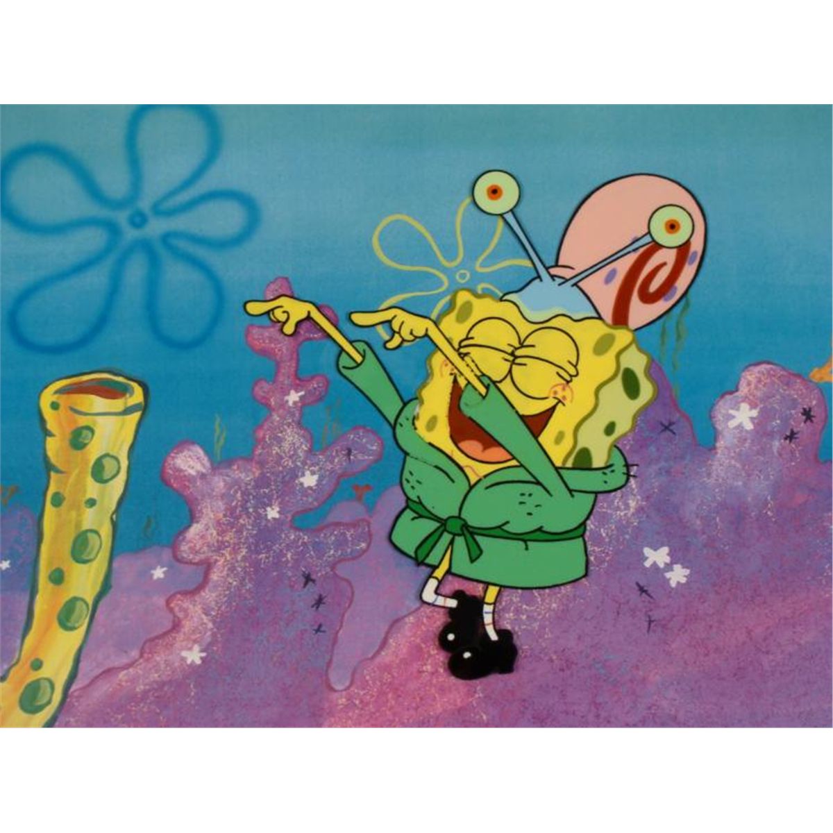 This animation cel and reproduction background are from the Nickelodeon TV show SpongeBob Squarepants. The story takes place under the deep blue sea in Bikini Bottom, where SpongeBob resides. SpongeBob, who is a yellow, porous sponge, is your typical happy-go-lucky character, as he is always cheerful and enjoys making people laugh. Patrick Star, SpongeBob's neighbor who is a starfish, is your average children's show idiot, as he boasts knowing nothing and is often getting himself into ridiculous situations. Between the homes of these two lies the home of the miserable Squidward, a squid, who is known for being grouchy and playing tricks on SpongeBob and Patrick. Both SpongeBob and Squidward work at the Krusty Krab, a fast food business run by the greedy money-loving Mr. Krabs, a crab, the arch rival of the evil, possibly misunderstood, Plankton. Another neighbor, Sandy Cheeks, an athletic squirrel who normally wears an astronaut's space suit, was introduced in "Tea at the Treedome." She spends most of her time inventing and experimenting. * SpongeBob is rockin out * Original Printed Background and Animated Cel Overall Size of Background: 11" x 17" Overall Size of the Cel: 10 1/2" x 12 1/2" Very good condition This is an original hand-painted cel set-up used in the production of an episode of "SpongeBob SquarePants." Each one-of-a-kind set-up represents a slight change in position of the characters. When individually photographed and projected in rapid succession, the images appear to move. * To create production cels, the original animator's drawing is transferred onto an acetate cel (by hand-inking and/or photo copying). The cel is then hand-painted on the reverse side. The background accompanying this set-up is a reproduction background. * The printed background and cel are ready to be matted and framed. The notations are located at the bottom of both. There is some paint fade to Spongebob's outline. *