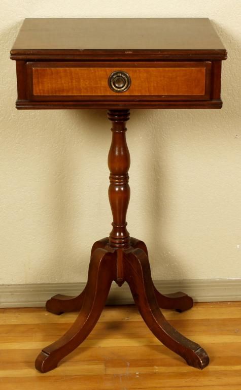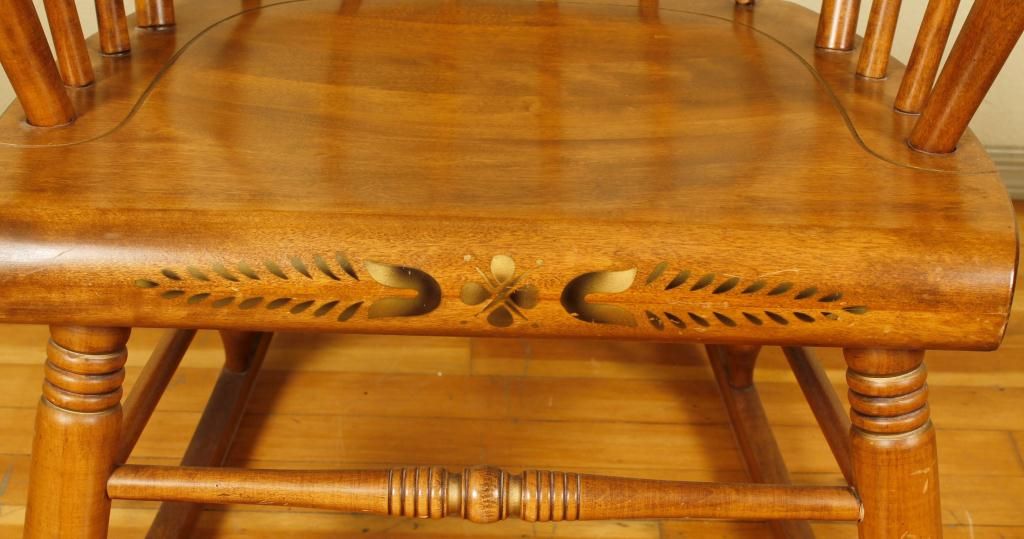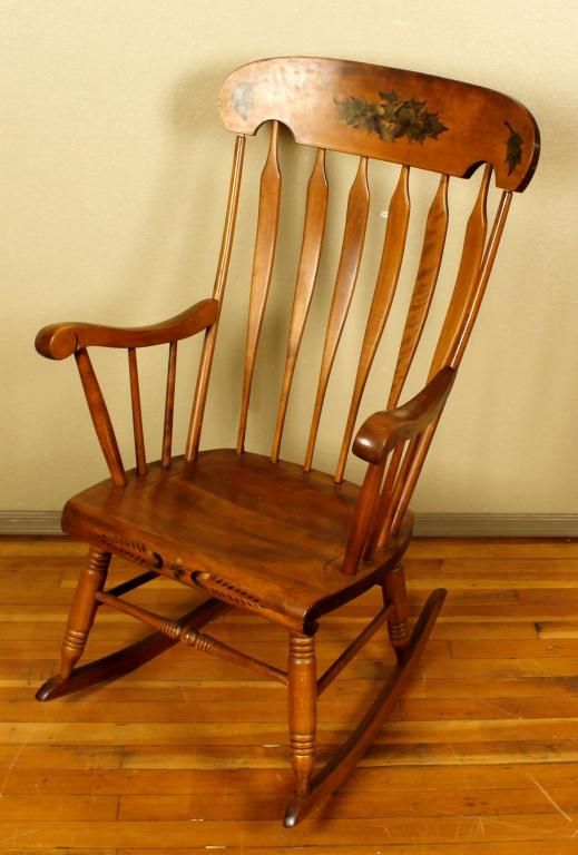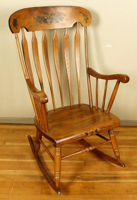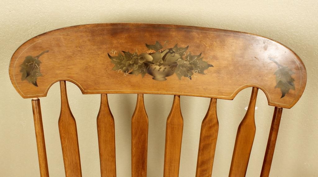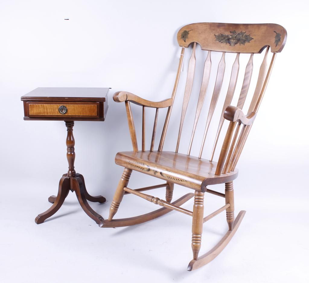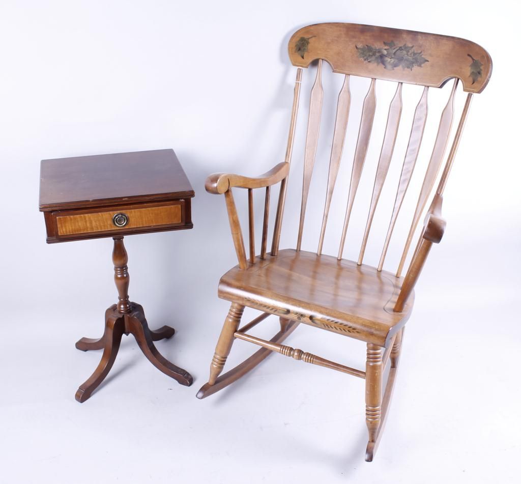 Maple rocking chair painted fruit decoration, ladder back, overall good condition that shows minor wear on arm; and a 1 drawer stand that measures 16"x13 1/2"x28", in overall good condition with minor scratches from age.