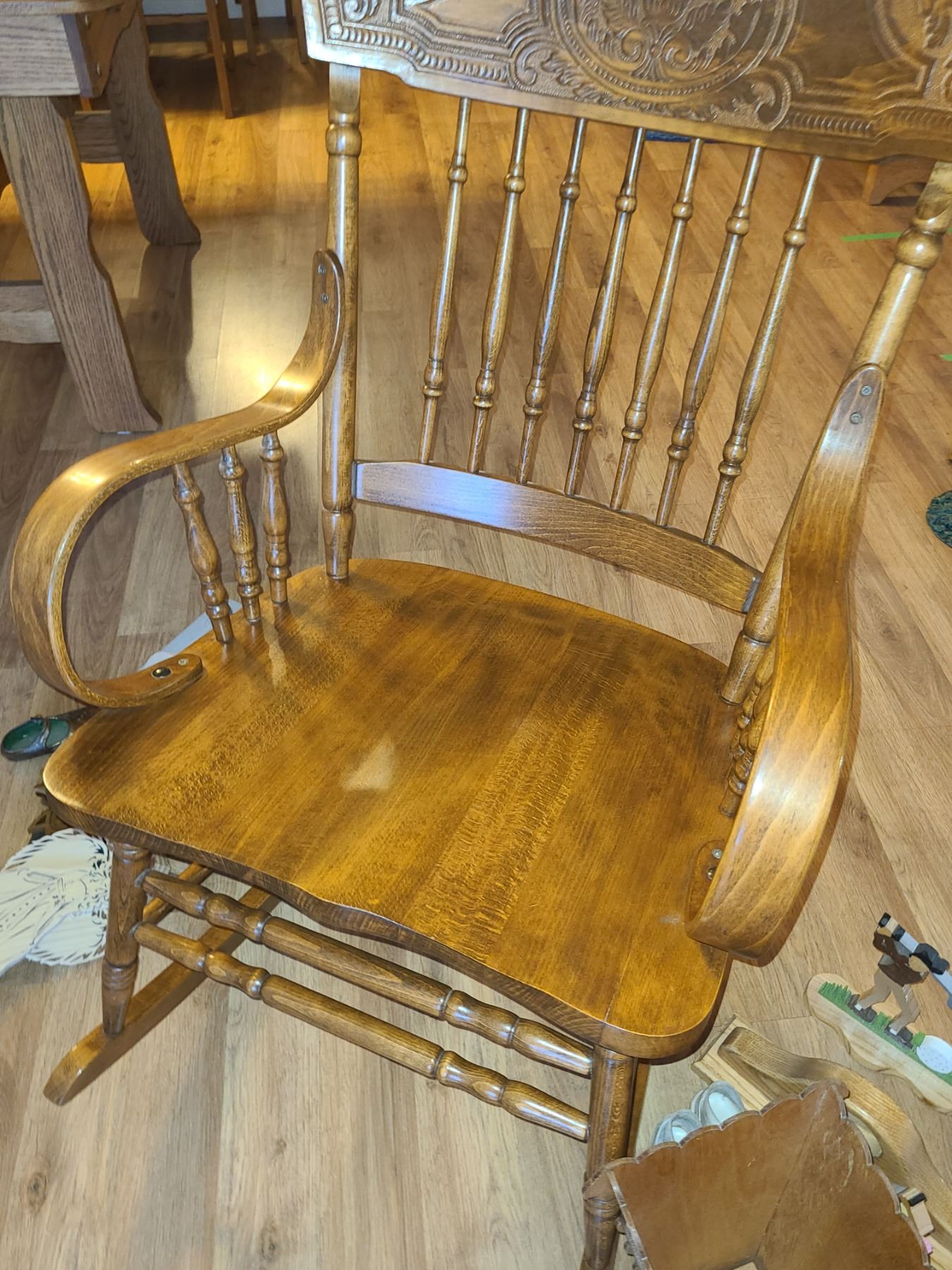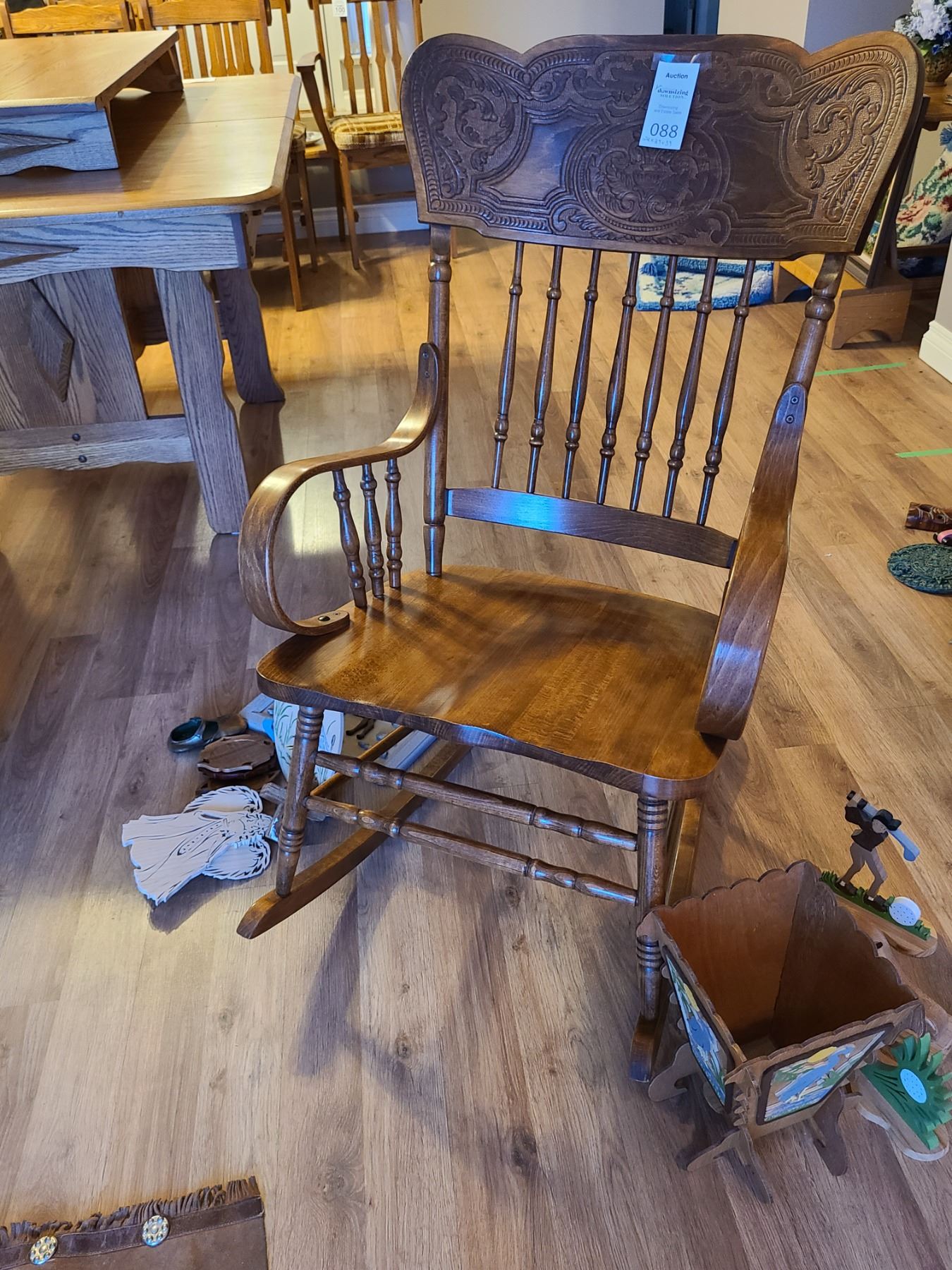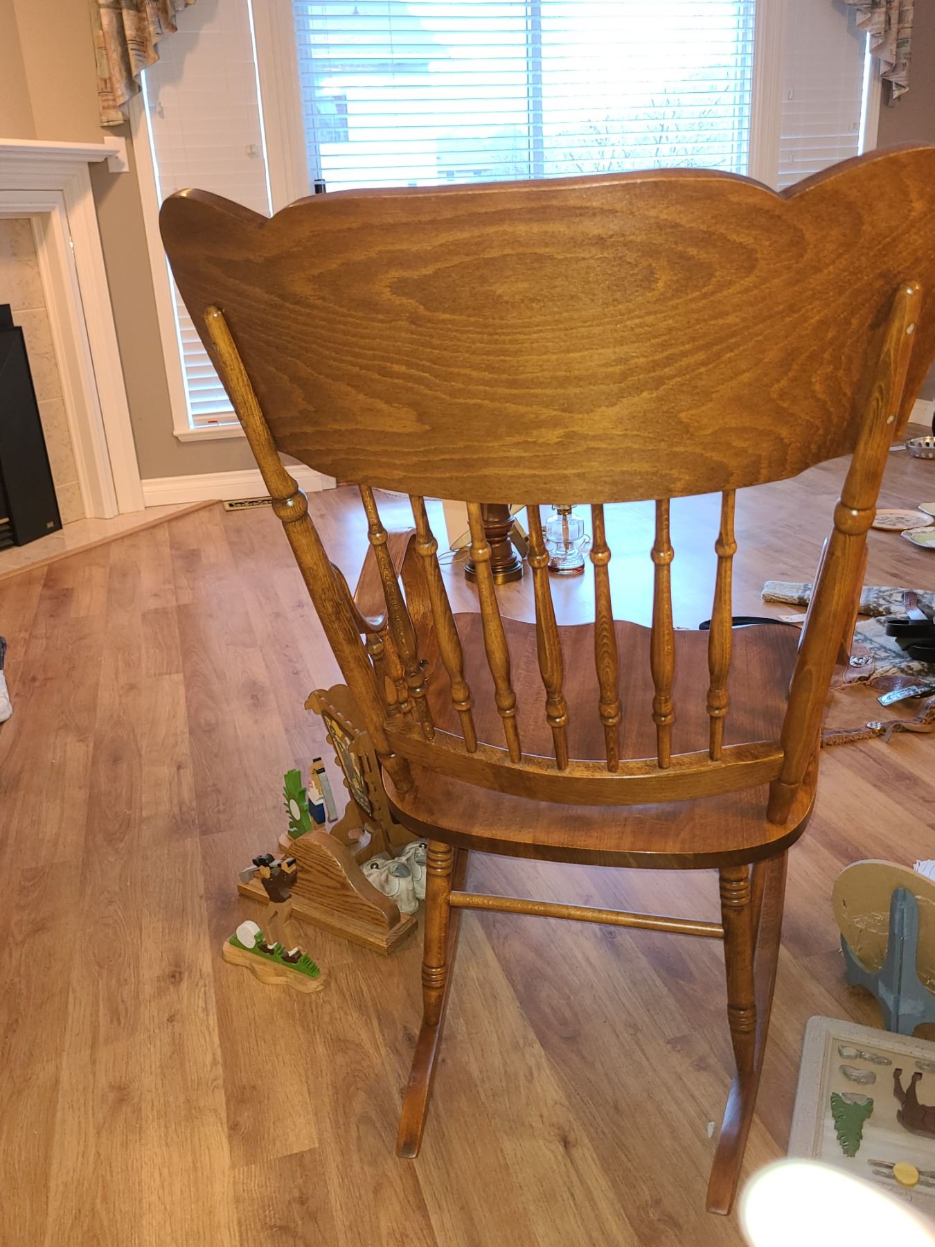 Wood rocking chair 22x29x39 and small items in lot. Pickup at 9 am.