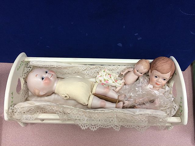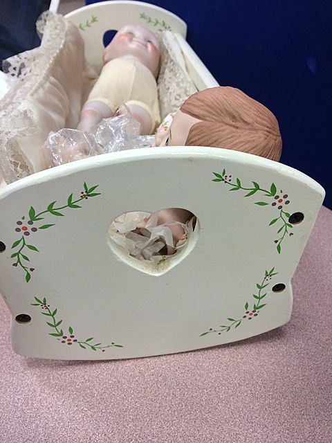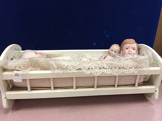 Rocking Doll Cradle and Kewpie, bisque doll head, and bisque arms for making doll. From the estate of Maria Cambra, member of the Jenny Lind Doll Club of Connecticut, lifetime collector and maker of dolls, who recently passed.