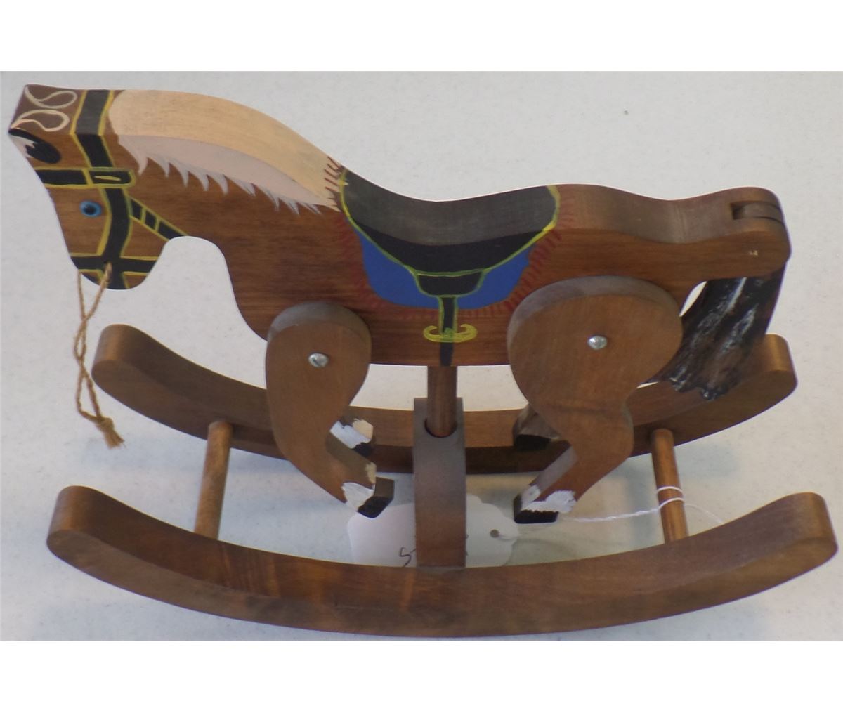 Nice Western Piece from the 1960's of a rocking horse with articulating legs. This item is in nice condition and both legs and tail move. The item is made from wood, rope and screws and measures 11x9x4 inches. Shipping $18.00