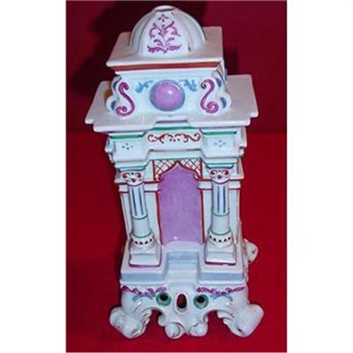 Circa 1840 Rockingham. I have been told that this item is a perfumer. I presume it would have had a finial of sort on the top. It is 10' in height. The base at the end of the feet is 5' square. Great Colors of pink, gold, green,blue,and white with nice gold gildin around the feet. A great Decorative item. A few minor chips on bottom of the base.