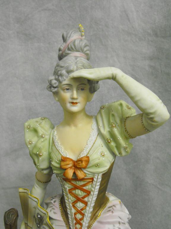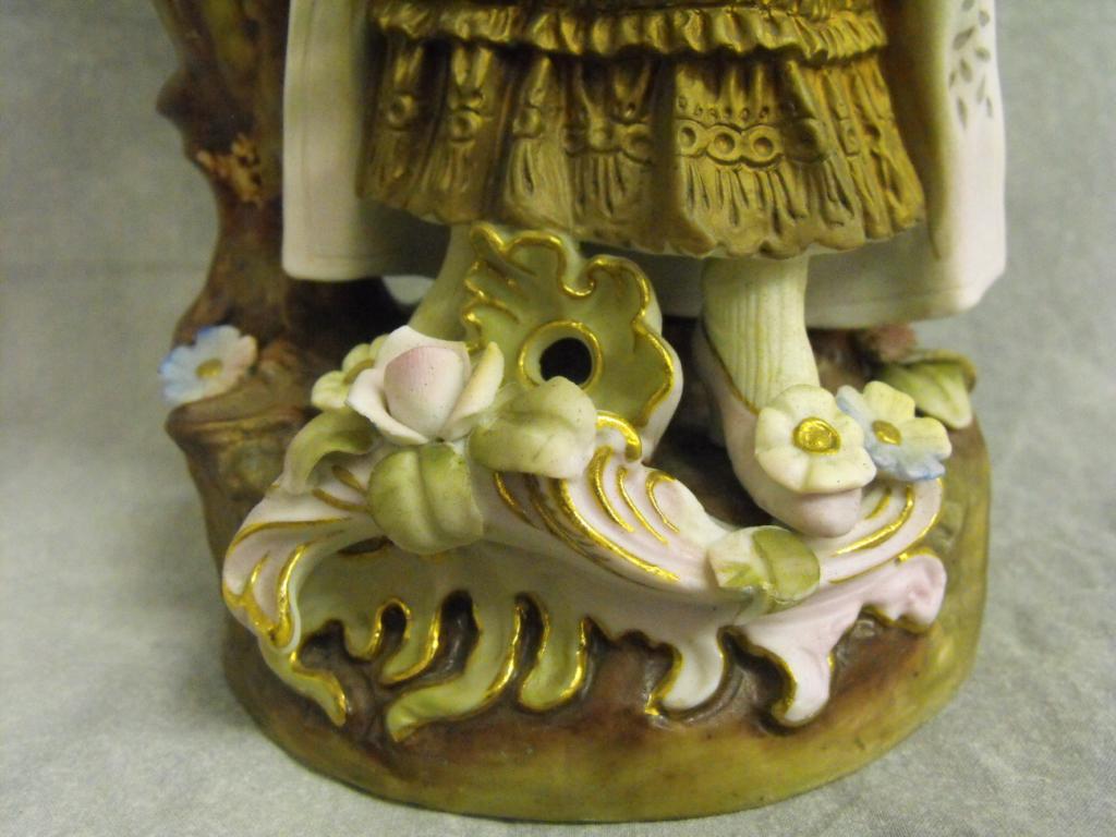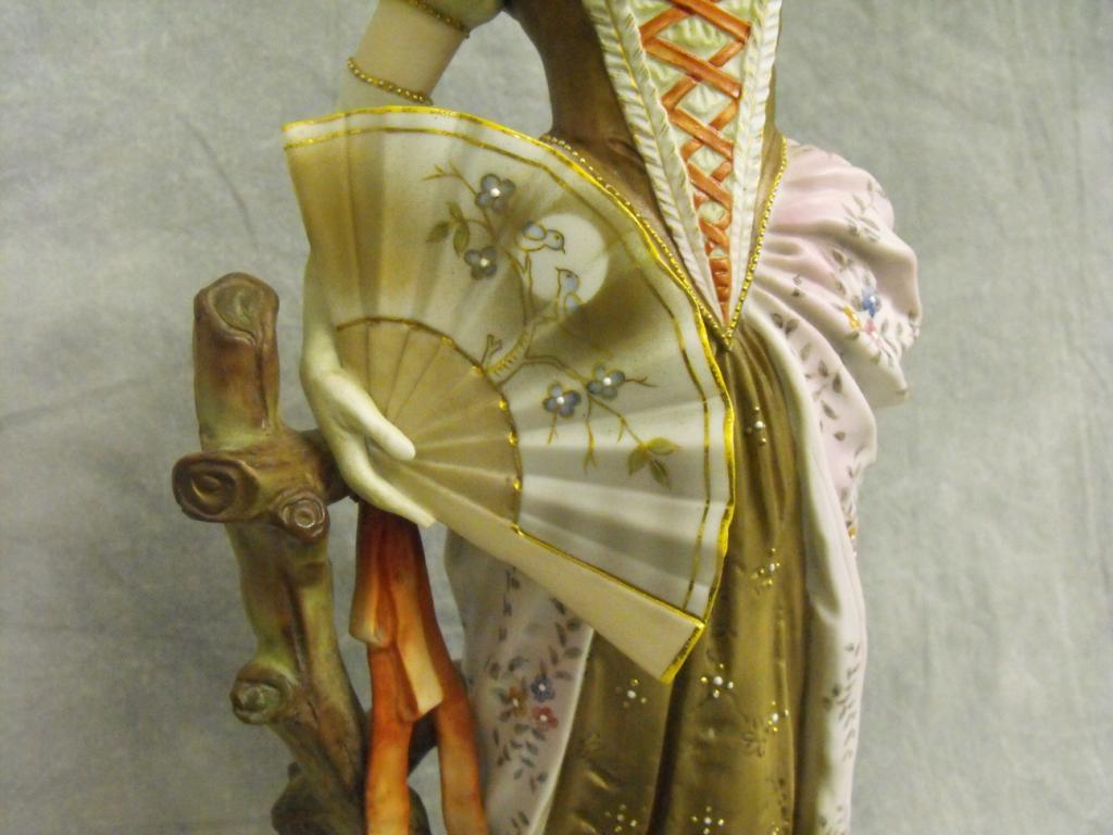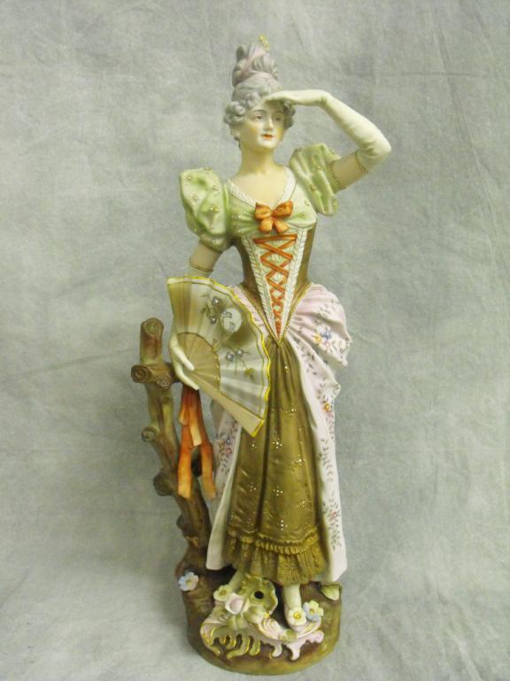 Beautiful English early Rockingham multi-Bisque Figurine of 17th century lady in multi Bisque tones. Dressed in esquisite clothing the face with lifelike qualities on cast mound base with floral scrolling fronts 21" tall