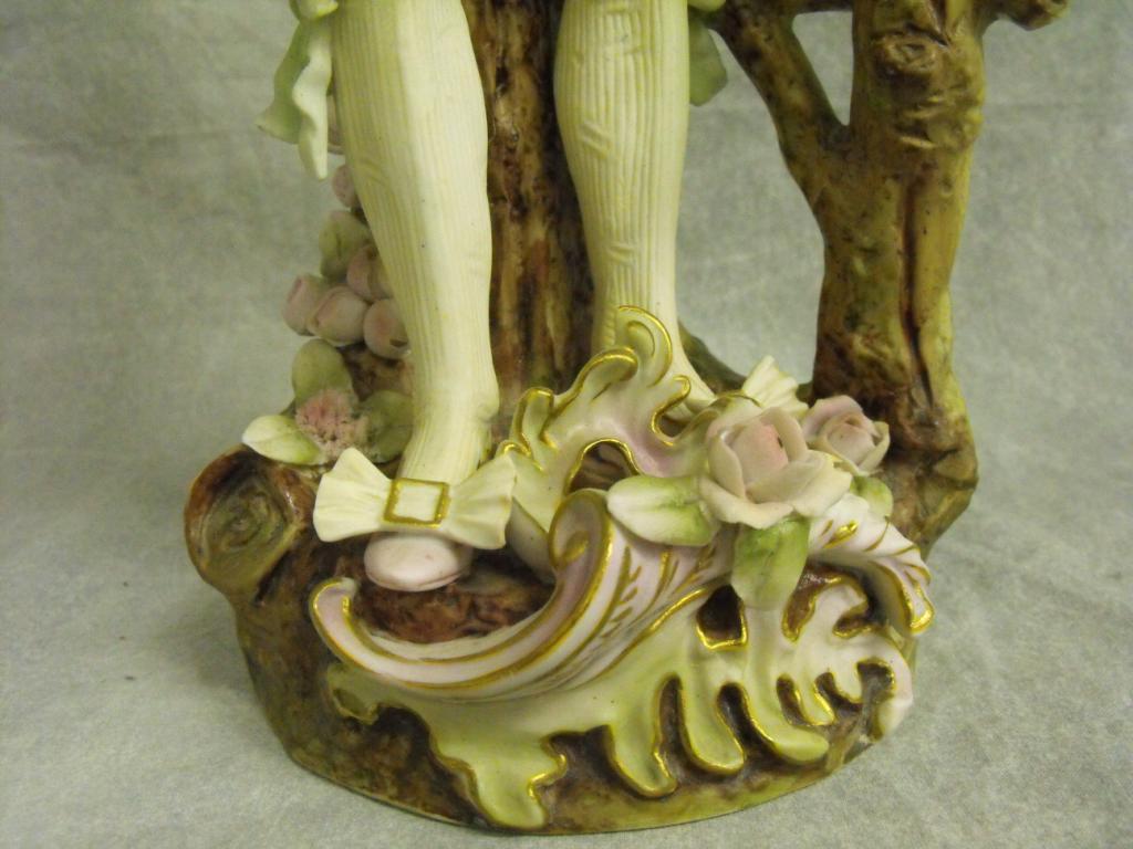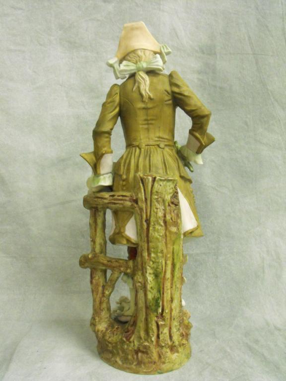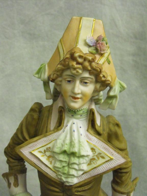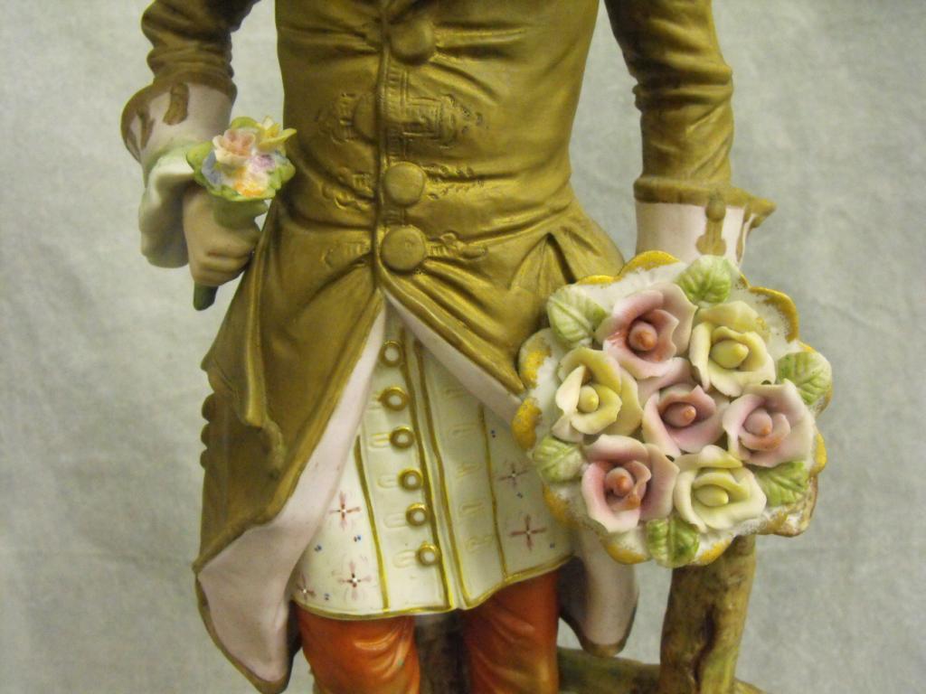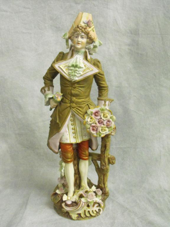 Beautiful English early Rockingham multi-Bisque Figurine of 17th century gentlemen in multi Bisque tones. Dressed in esquisite clothing the face with lifelike qualities on cast mound base with floral scrolling fronts 21" tall
