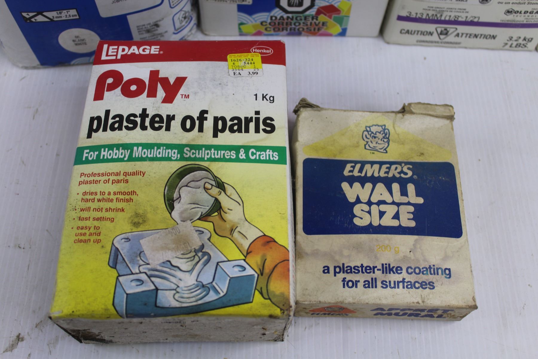 Rockite Expansion Cement Box - As Is, Ultracolor Bag of Sanded Grout - As Is, Ultracolor Box of Sanded Grout - As Is, (2) Box of PolyBlend Sanded Grout - As Is, Box of Lepage Plaster of Paris - As Is, & Elmer's Wall Size Plaster - As Is