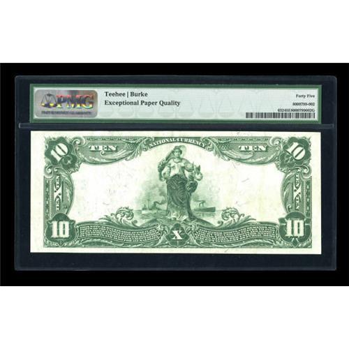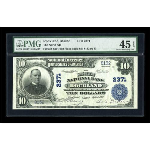 <B>Rockland, ME</B></I> - $10 1902 Plain Back Fr. 632 <B>The North NB</B></I> Ch. # 2371<BR> Plenty of embossing remains on this tri-folded note with stamped signatures. <B>PMG Choice Extremely Fine 45 EPQ</B></I>.<BR><BR><b>Shipping:</b> Coins & Currency (<a target="_blank" href="http://www.heritageauctions.com/common/shipping.php">view shipping information</a>)