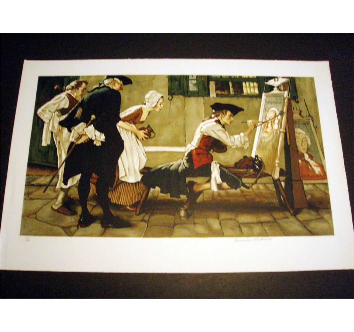 Norman Rockwell. "Colonial Sign Painter" Hand signed and numbered limited edition lithograph. Embossed with the publisher's blind stamp and accompanied by a letter of authenticity from Eleanor Ettinger, Inc. This lithograph is part of the publisher's suite and has never been framed or displayed. It is in mint condition and there is not a nicer one to be found. 23 1/8 x 35 1/8 inches