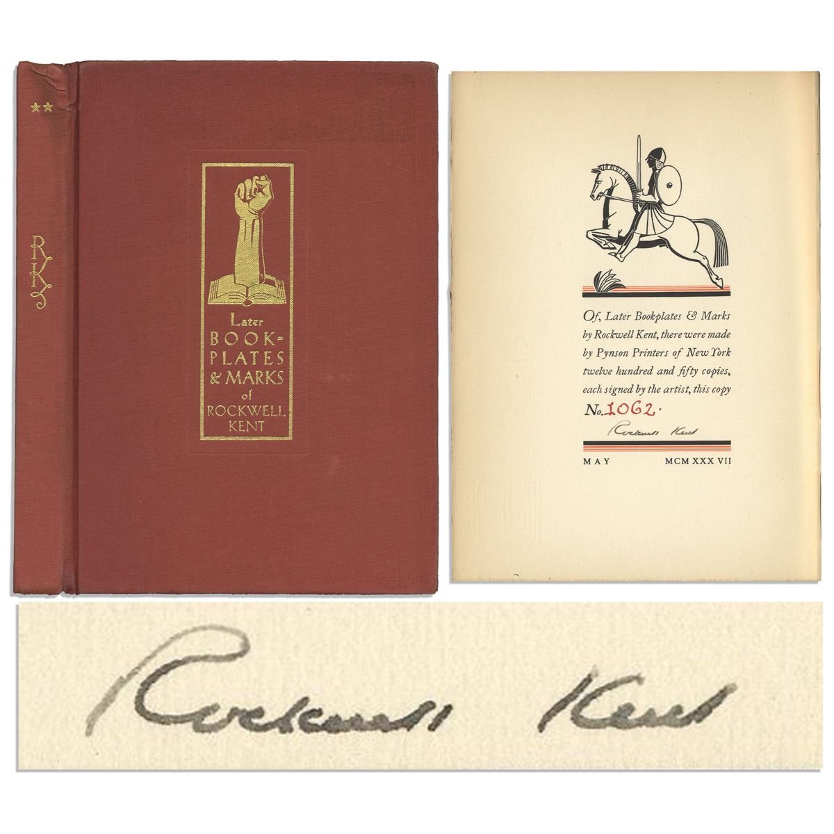 First edition of ''Later Bookplates & Marks of Rockwell Kent'' with a preface written by the artist. Pynson Printers: New York: 1937. Limited edition volume, numbered 1062 of 1250, is signed on the limitation page, located at the back of the book: ''Rockwell Kent''. The 83 uncut pages feature black and white and duotone illustrations of bookplates, initials and marks. Minor edge wear to rust cloth boards with gilt lettering. The 5.25'' x 7.25'' volume without dustjacket is in very good condition.
