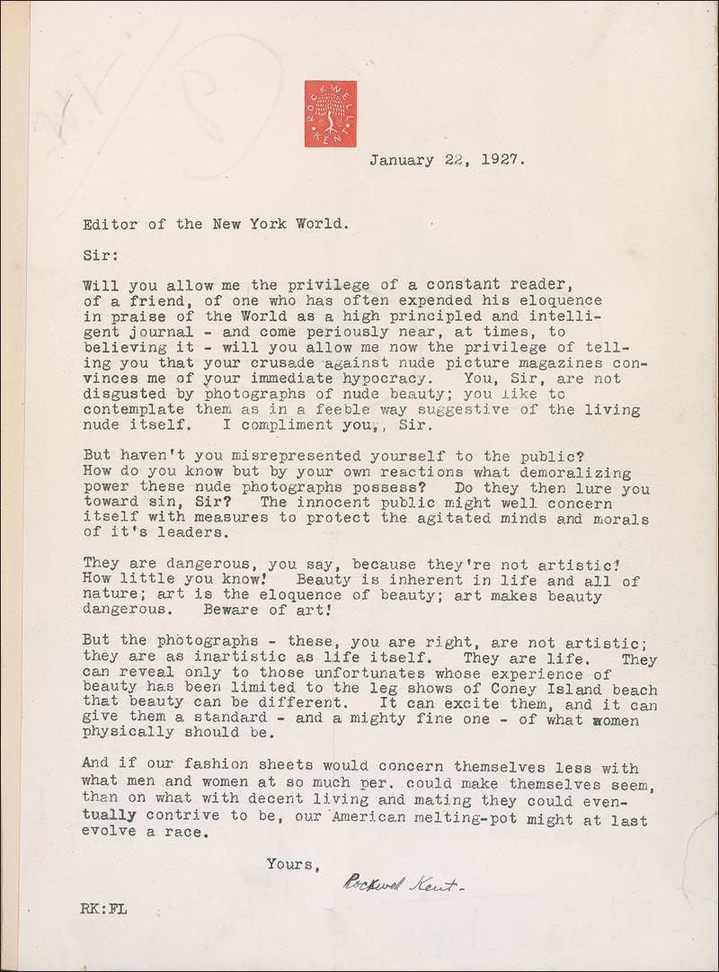 TLS, one page, 7.5 x 10.5, personal letterhead, January 22, 1927. Letter to the editor of the New York World. In full: “Will you allow me the privilege of a constant reader, of a friend, of one who has often expended his eloquence in praise of the World as a high principled and intelligent journal—and come periously near, at times, to believing it—will you allow me now the privilege of telling you that your crusade against nude picture magazines convinces me of your immediate hypocracy. You, Sir, are not disgusted by photographs of nude beauty; you like to contemplate them as in a feeble way suggestive of the living nude itself. I compliment you, Sir. But haven't you misrepresented yourself to the public? How do you know but by your own reactions what demoralizing power these nude photographs possess? Do they then lure you toward sin, Sir? The innocent public might well concern itself with measures to protect the agitated minds and morals of its leaders. They are dangerous, you say, because they're not artistic! How little you know! Beauty is inherent in life and all of nature; art is the eloquence of beauty; art makes beauty dangerous. Beware of art! But the photographs—these, you are right, are not artistic; they are as inartistic as life itself. They are life. They can reveal only to those unfortunates whose experience of beauty has been limited to the leg shows of Coney Island beach that beauty can be different. It can excite them, and it can give them a standard—and a mighty fine one—of what women physically should be. And if our fashion sheets would concern themselves less with what men and women at so much per. could make themselves seem, than on what with decent living and mating they could eventually contrive to be, our American melting-pot might at last evolve a race.”