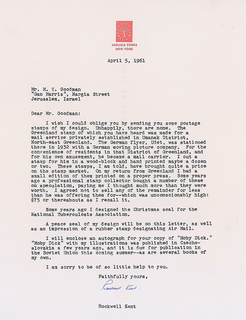 TLS, one page, 8.5 x 11, personal letterhead, April 5, 1961. Letter to an admirer. In part: “I with I could oblige you by sending you some postage stamps of my design. Unhappily, there are none. The Greenland stamp of which you have heard was made for a mail service privately established in Umanak District, North-east Greenland. The German flyer, Udet, was stationed there in 1932 with a German moving picture company. For the convenience of residents in that District of Greenland, and for his own amusement, he became a mail carrier. I cut a stamp for him in a wood-block and hand printed maybe a dozen or two. These stamps, I am told, have brought quite a price on the stamp market. On my return from Greenland I had a small edition of them printed on a proper press. Some years ago a professional stamp collector bought a number of these on speculation, paying me I thought much more than they were worth. I agreed not to sell any of the remainder for less than he was offering them for—which was unconscionably high: $75 or thereabout as I recall it.” In fine condition, with central horizontal and vertical folds, and a few mild surface creases.
