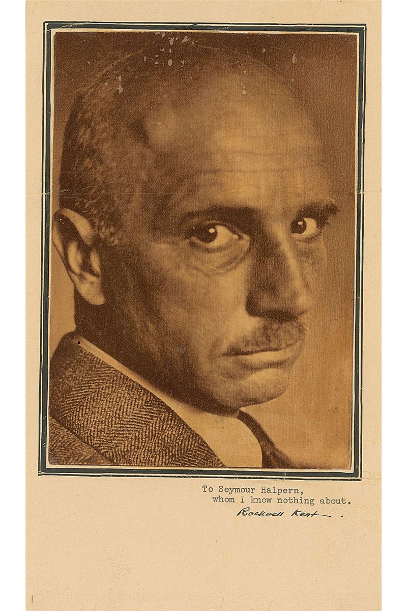 Glossy 4.75 x 6.75 photo affixed to an off-white 5.75 x 9.5, signed on the sheet in black ink, “Rockwell Kent,” below a humorous typed inscription, “To Seymour Halpern, whom I know nothing about.” In very good condition, with two horizontal folds, and scattered spotting to the image.
