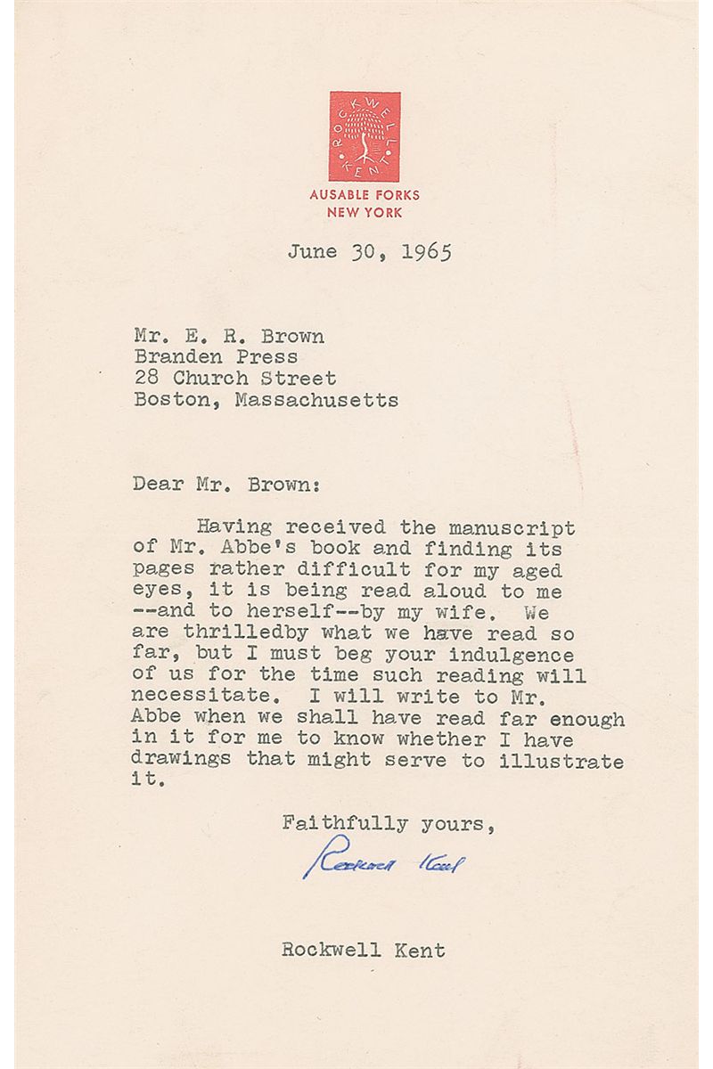 TLS, one page, 5.5 x 8.5, personal letterhead, June 30, 1965. Letter to E. R. Brown at Branden Press in Boston. In full: “Having received the manuscript of Mr. Abbe’s book and finding its pages rather difficult for my aged eyes, it is being read aloud to me—and to herself—by my wife. We are thrilled by what we have read so far, but I must beg your indulge of us for the time such reading will necessitate. I will write to Mr. Abbe when we shall have read far enough in it for me to know whether I have drawings that might serve to illustrate it.” In fine condition. Kent illustrated George Abbe’s book The Non-Conformist: The Autobiography of a Conformist.