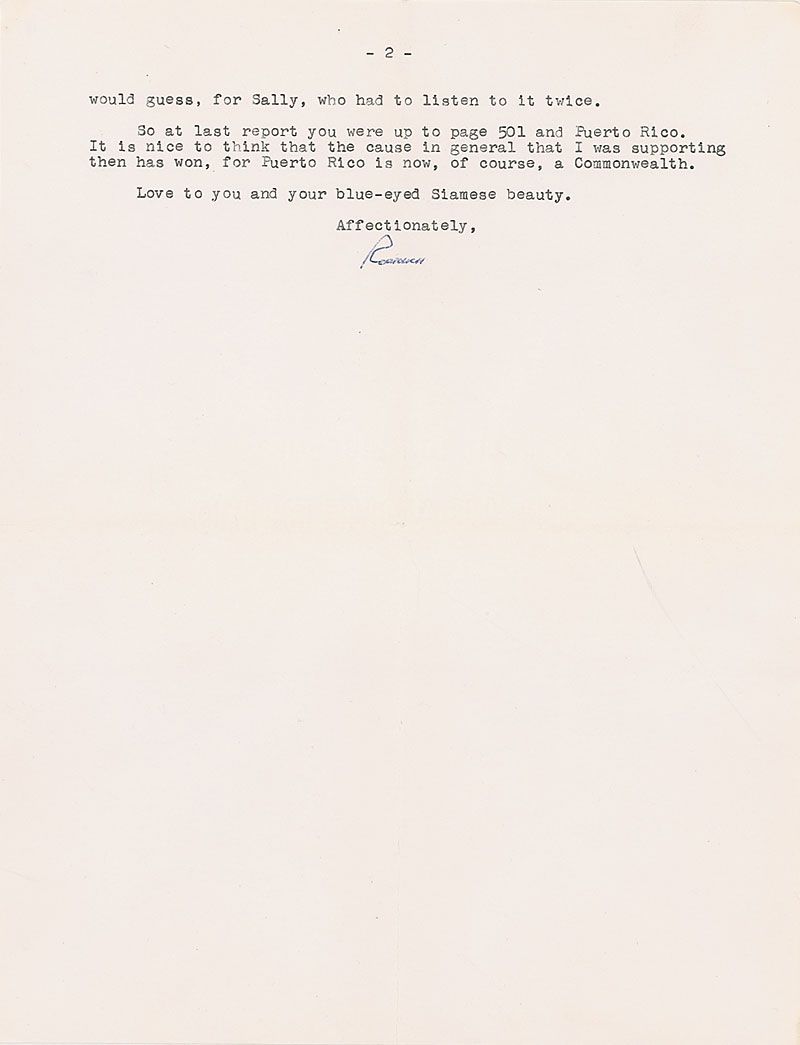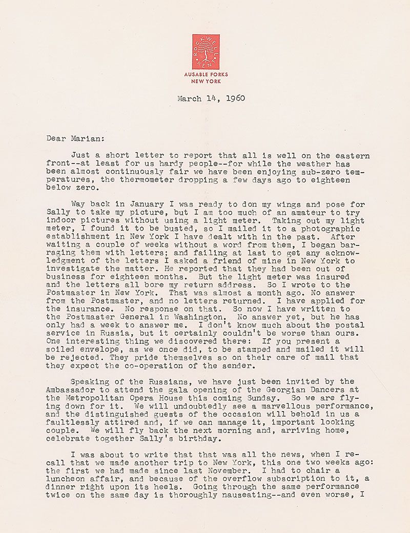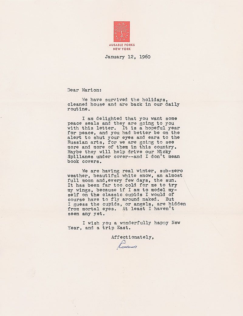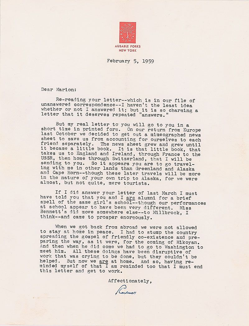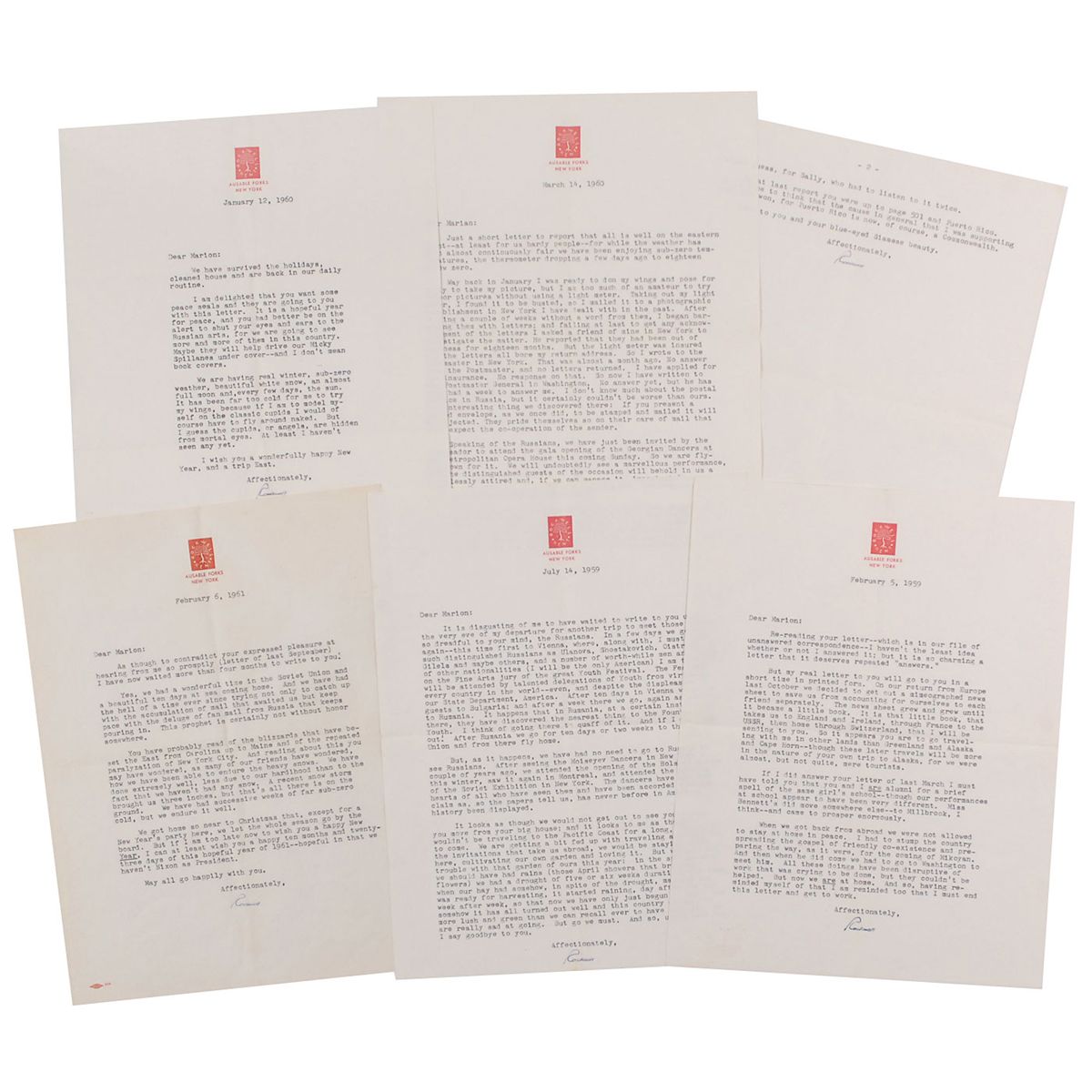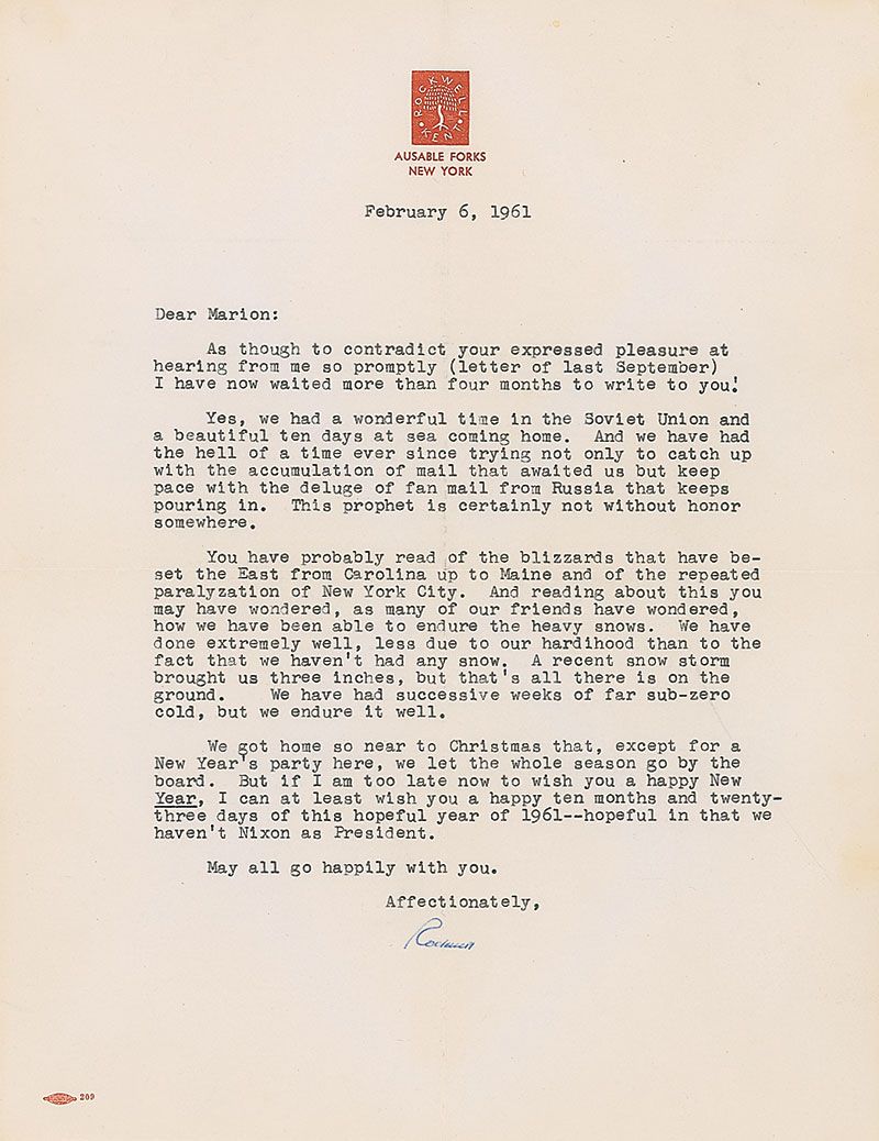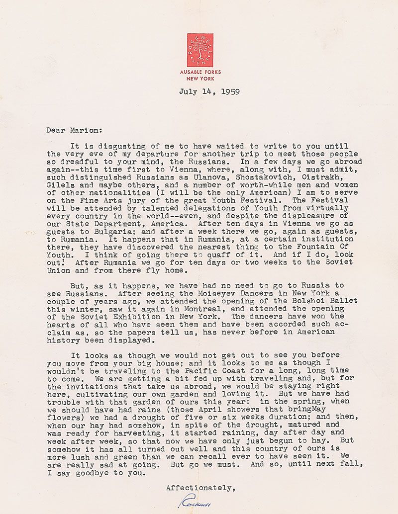 Collection of five TLSs from Kent to Marion Foley, each signed “Rockwell,” totaling six pages, dated between 1959 and 1961. Most letters relate to Kent’s travels in the Soviet Union, with some mentioning artistic endeavors. One, in part: “It is a hopeful year for peace, and you had better be on the alert to shut your eyes and ears to the Russian arts, for we are going to see more and more of them in this country. Maybe they will help drive our Mickey Spillanes under cover—and I don’t mean book covers.” Another, in part: “In a few days we go abroad again…along with, I must admit, such distinguished Russians as Ulanova, Shostakovich, Oistrakh, Gilels and maybe others.” A third, in part: “I am too much of an amateur to try indoor pictures without using a light meter. Taking out my light meter, I found it to be busted, so I mailed it to a photographic establishment in New York…they had been out of business for eighteen months.” In overall fine to very fine condition. Three are accompanied by their original mailing envelopes.