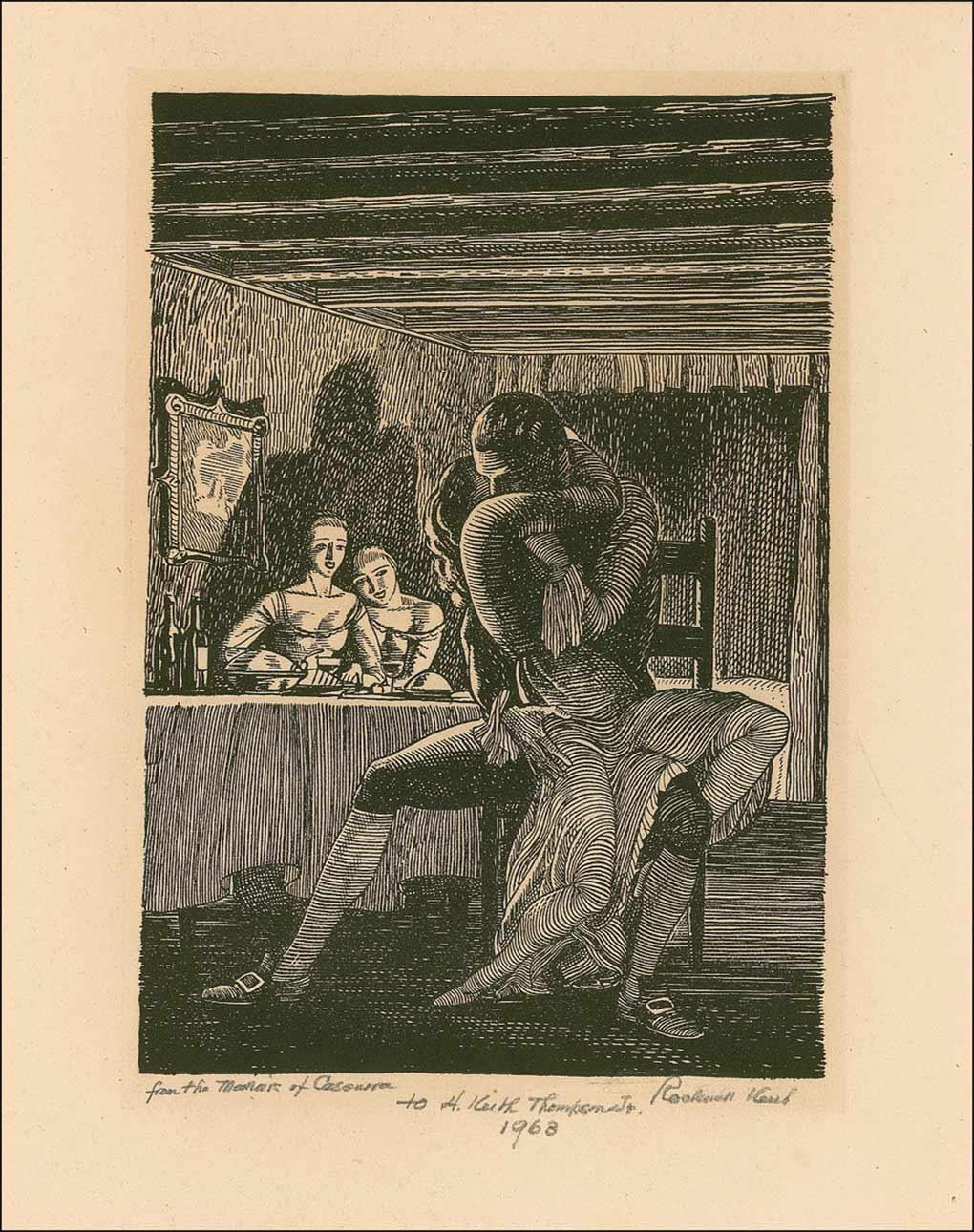 American artist and illustrator (1882–1971) known for his crisp modernist style. Print of an engraving from Memoirs of Casanova, 7.5 x 9.5, signed and inscribed in the lower border in pencil, “From the Memoirs of Casanova, to H. Keith Thompson, Jr., 1968, Rockwell Kent.” In fine condition. H. Keith Thompson was noted autograph dealer Charles Hamilton’s assistant.