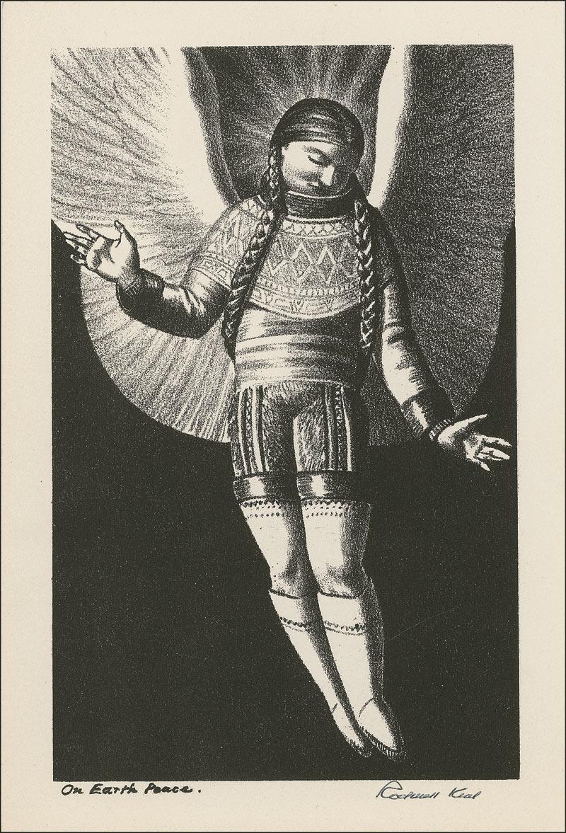 Visually stunning print, 6.25 x 9.25, entitled On Earth Peace depicting an angel in native Alaskan dress, signed in the lower border in black ink. In very fine condition. RRAuction COA.