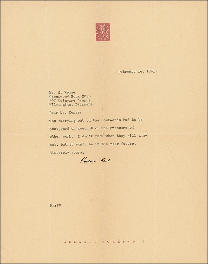 TLS, one page, 8 x 10, personal letterhead, February 14, 1931. Kent informs a book dealer of a delay. In full: “The carrying out of the book-ends had to be postponed on account of the pressure of other work. I don’t know when they will come out, but it won’t be in the near future.” Moderate intersecting folds, one through a single letter of signature, and a small separation to the central vertical fold, otherwise fine condition. RRAuction COA.