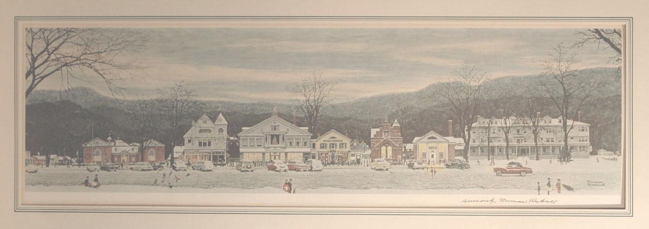 Norman Rockwell print, ''Main Street, Stockbridge at Christmas'' signed in black ink at lower right ''Sincerely, Norman Rockwell.'' Dynamic horizontal panoramic Rockwell image depicts Small Town America at dusk, blanketed by winter, with children playing in the snow. Image measures 11'' x 30''. Mounted to foam core. Fading to print and signature. Good condition.