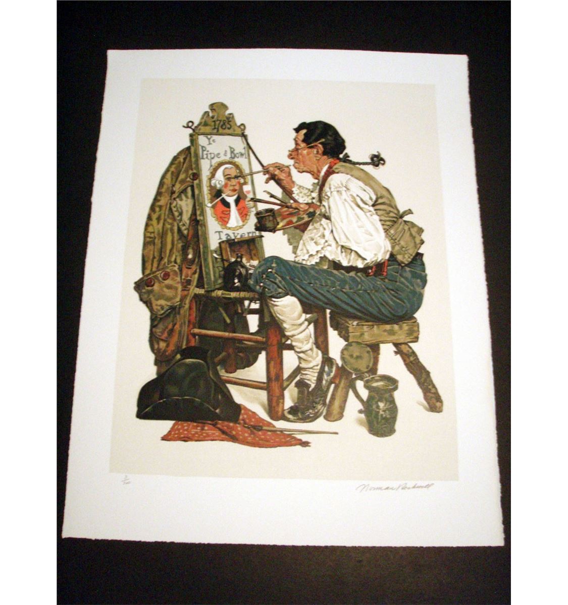 Norman Rockwell. "Ye Pipe and Bowl" Hand signed and numbered limited edition lithograph. Embossed with the publisher's blind stamp and accompanied by a letter of authenticity from Eleanor Ettinger, Inc. This lithograph is part of the publisher's suite and has never been framed or displayed. It is in mint condition and there is not a nicer one to be found. 21 x 26 1/2 inches