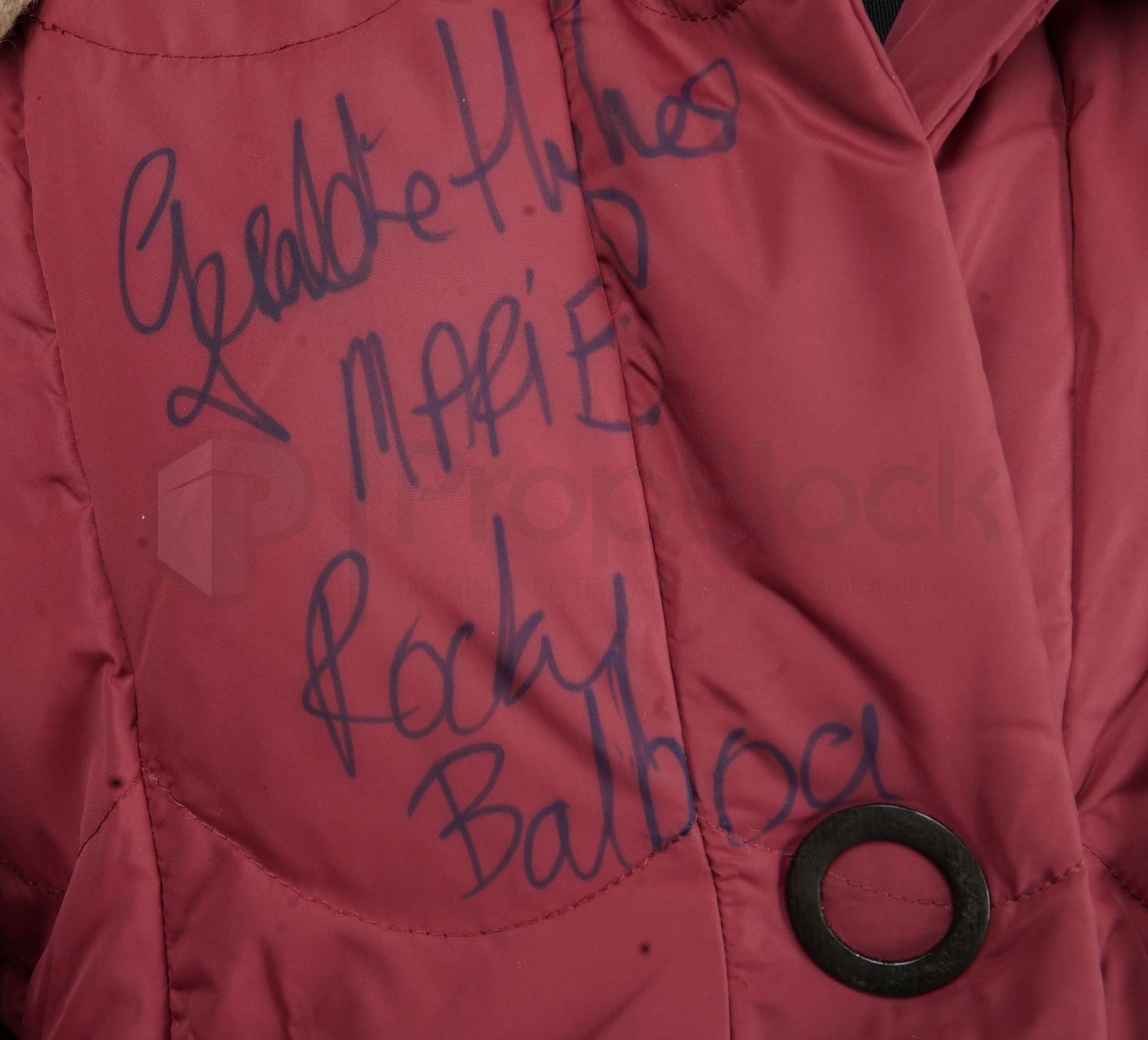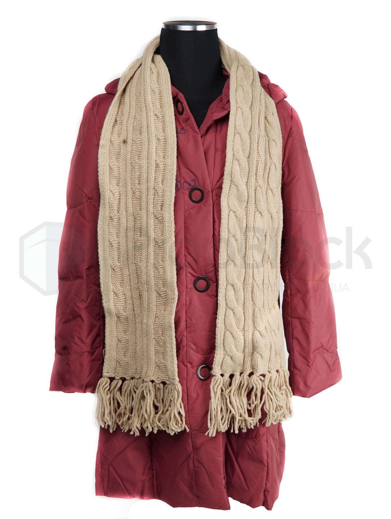 Long overcoat and scarf used by the character of Marie, actress Geraldine Hughes in the 2016 Sylvester Stallone film Rocky Balboa. Now long-retired, Rocky (Sylvester Stallone) runs a Philadelphia eatery and mourns the loss of his beloved wife, Adrian. Yearning to recapture a bit of his glory days, he plans to re-enter the ring for a few low-profile, local matches. This set features a red long sleeved padded coat with button up front that has been signed in blue ink by the actress on the right chest area. Also included is a tan knitted scarf and pair of gloves. This set remains in excellent, production used condition.