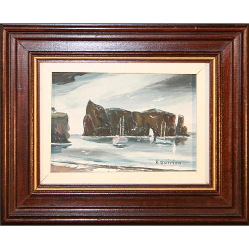 This painting of the Montreal coastline is a testament to the skillful impressionistic style of Raymond Quirion. Born in 1919, Quirion became acquainted with the painters Frederick Rothermel and Boris Chezar, who influenced his work and under whose tutelage he discovered oil painting. In 1963 Quirion dedicated himself entirely to his paintings. He had his studio built on Mont Joli and spent the spring, summer and autumn in Perce every year, gathering inspiration for his works and creating canvases in the surroundings of the sea and the great Rock of Perce. This particular painting is of the famous rock itself and demonstrates the artist?s wonderful ability to capture the nuances of the Montreal coastline. Beautifully framed in a dark wood frame and a white liner, the finished size measures 11? by 9?. This painting will fit into almost any décor and is perfect for a small space, where it can enhance and enliven by bringing a vision of the sea to life.
