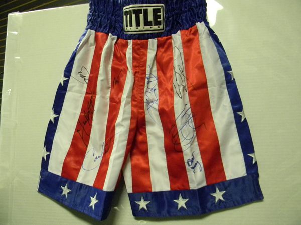 Everlast boxing trunks signed by the stars of the "Rocky" film franchise including Sylvester Stallone, Carl Weathers, Mr. T., Burt Young, Hulk Hogan, and Talia Shire. They are in excellent condition and were obtained from Field of Dreams. This item comes with a certificate of authenticity guaranteed for the life of the piece.