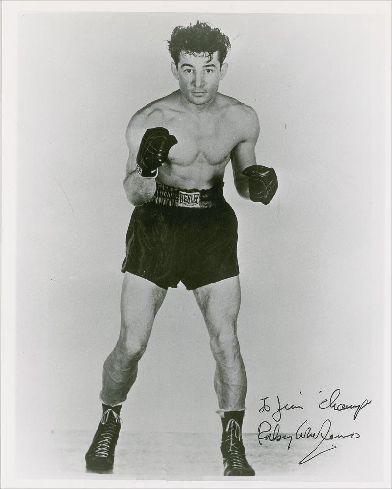 Glossy 8 x 10 photo of Graziano in his prime, signed and inscribed in black ink “To Jim, Champ Rocky Graziano.” Creasing to top corners and edge, otherwise fine condition.