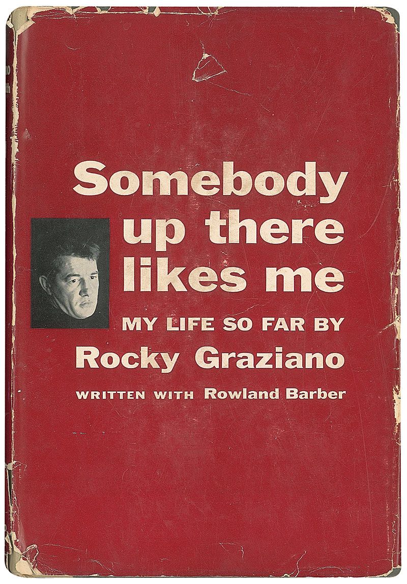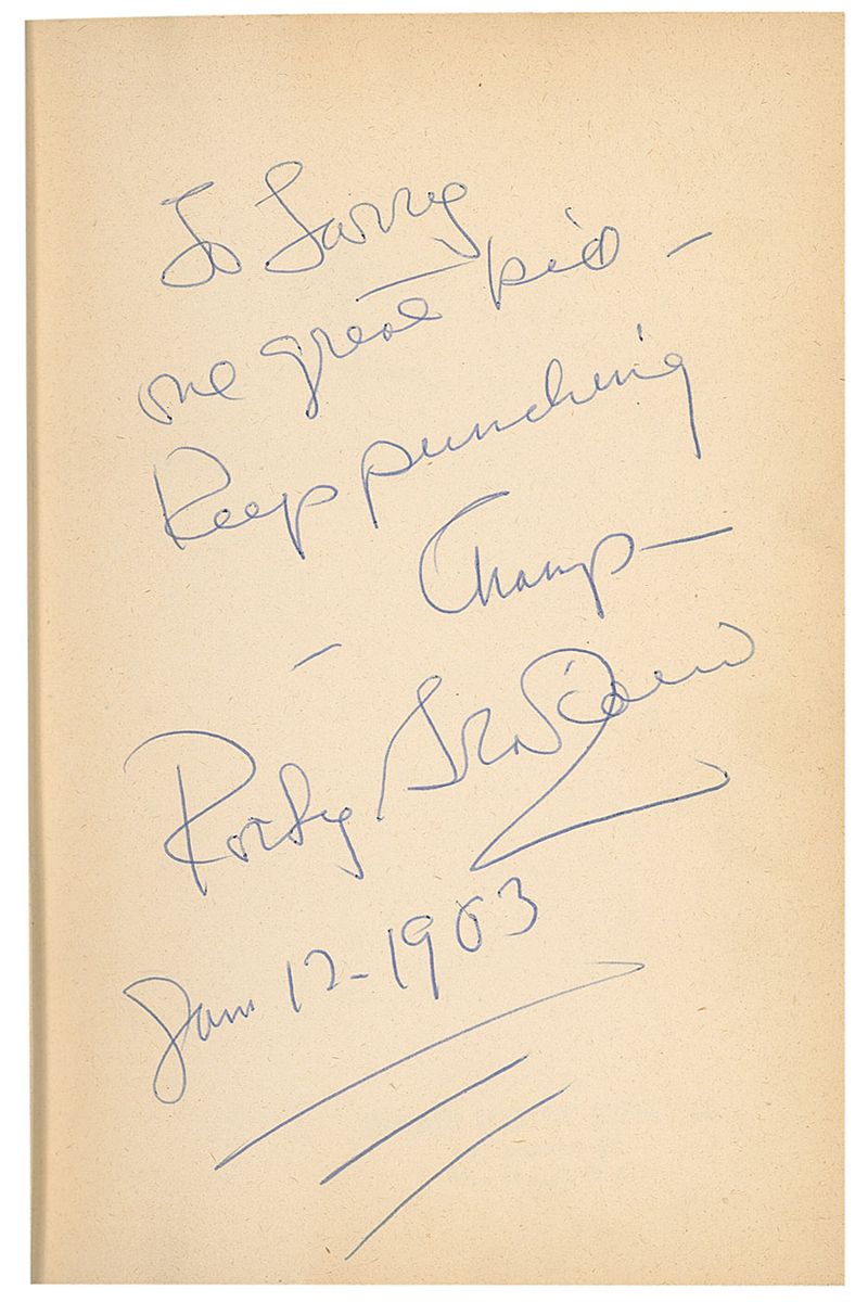 Signed book: Somebody Up There Likes Me. First edition, first printing. NY: Simon & Schuster, 1955. Hardcover with dust jacket, 6 x 8.5, 375 pages. Signed and inscribed on the first free end page, “To Larry, one great kid—keep punching Champ—Rocky Graziano, Jan 12, 1963.” In very good condition, with a light shade of toning to signed page, a business stamp to second free end page, and some toning, tears, and paper loss to the clipped dust jacket.