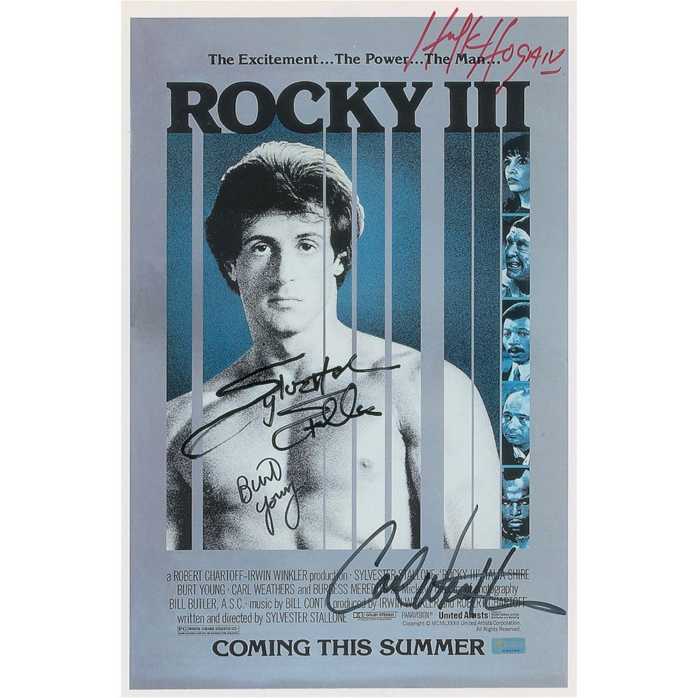 Color semi-glossy 11 x 16.75 print of the poster for the 1982 sports drama Rocky III, signed in black felt tip by Sylvester Stallone, Burt Young, and Carl Weathers, and in red felt tip by Hulk Hogan. In fine condition, with a short tear to the left edge, and Stallone retracing the first letter of his signature due to poor ink flow on the first attempt.