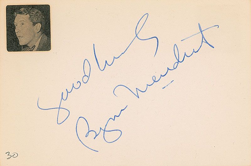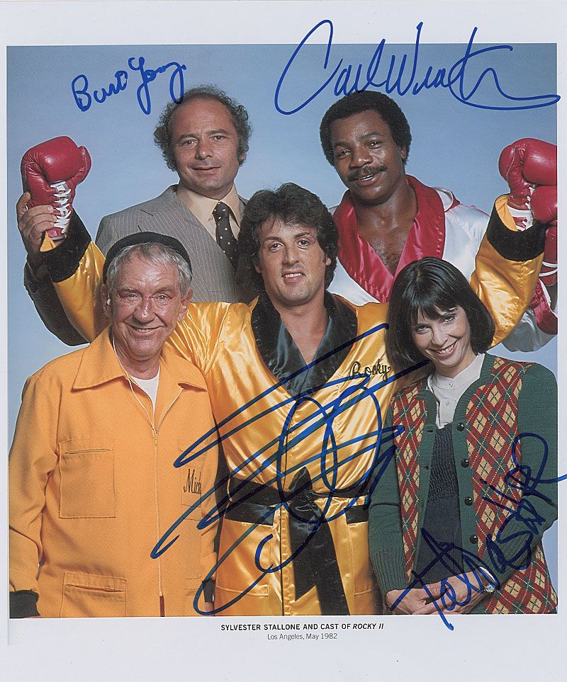Color glossy 10 x 12 publicity photo of the cast of Rocky II, signed in blue felt tip by Sylvester Stallone, Talia Shire, Carl Weathers, and Burt Young. In fine condition. Accompanied by a felt tip signature of Burgess Meredith on an off-white 5 x 3 card.