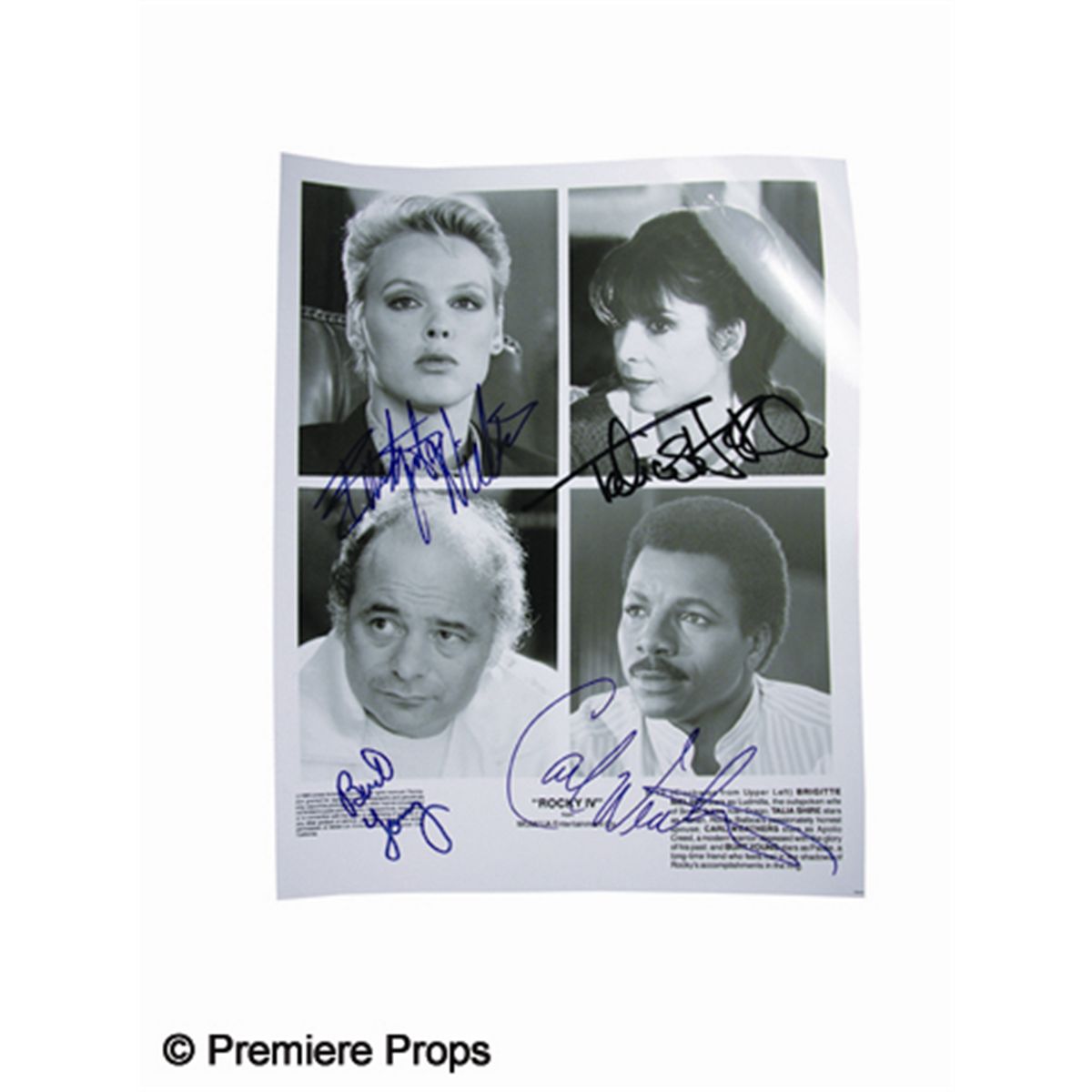 Black and white photo depicting the supporting cast of Rocky IV (1985), Brigitte Nielsen, Burt Young, Carl Weathers and Talia Shire, signed by each actor in felt pens. (8x10)