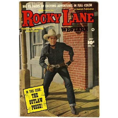 <B>Rocky Lane Western #15 Davis Crippen ("D" Copy) pedigree (Fawcett, 1950) Condition: VF.</B></I> Photo cover. Black Jack's Hitching Post begins. Overstreet 2007 VF 8.0 value = $89. <I>From the Crippen Collection.</B></I><BR><BR><b>Shipping:</b> Comics - Unslabbed (<a target="_blank" href="http://www.heritageauctions.com/common/shipping.php">view shipping information</a>)
