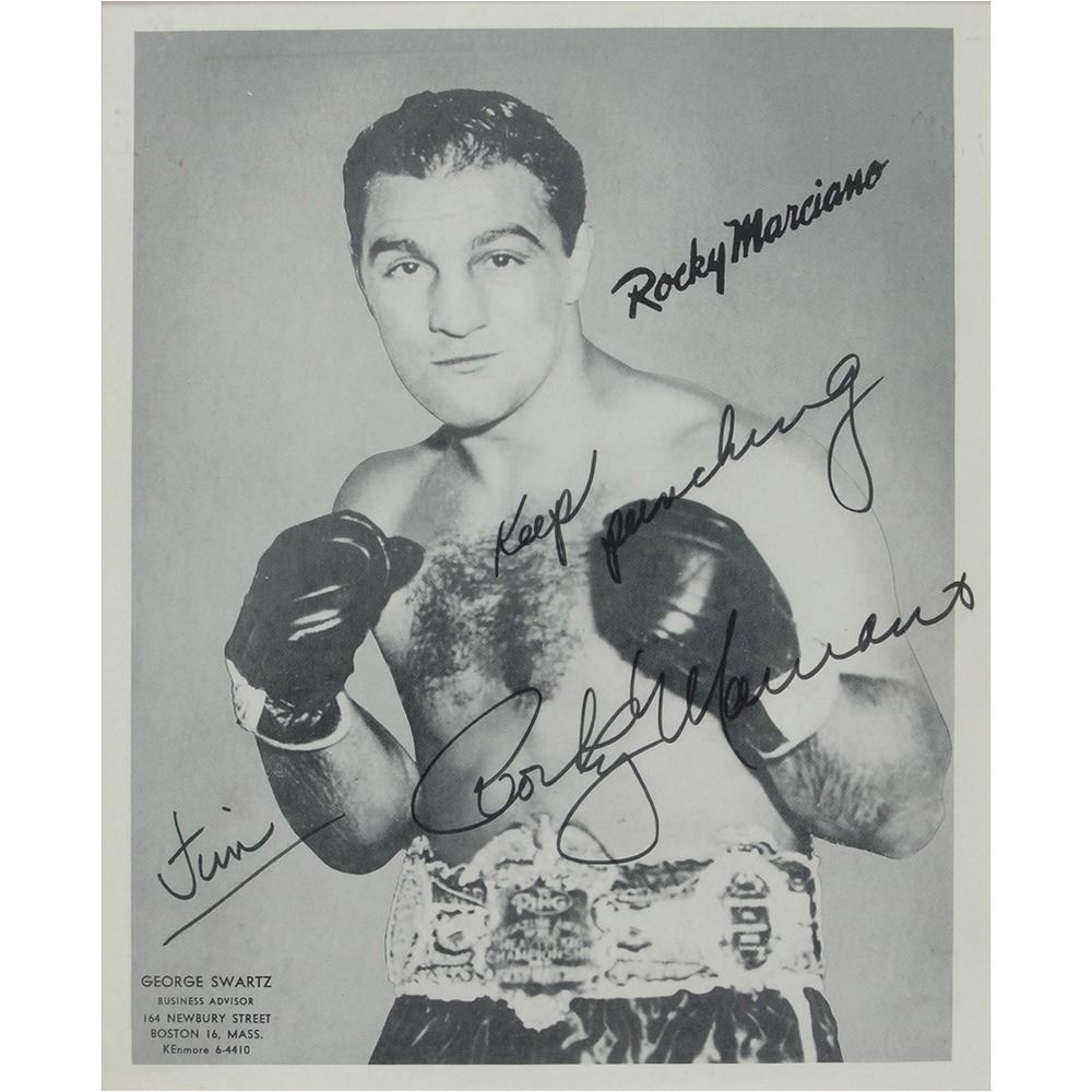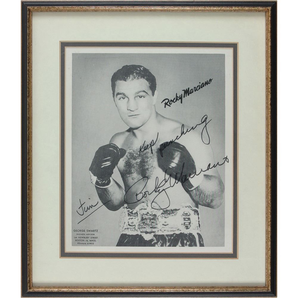 Vintage 8 x 10 cardstock photo of Marciano posing in his championship belt, boldly signed and inscribed in black felt tip, "Jim, Keep punching, Rocky Marciano." Double-matted and framed to an overall size of 12.5 x 14.5. In fine condition. Accompanied by a full letter of authenticity from JSA.