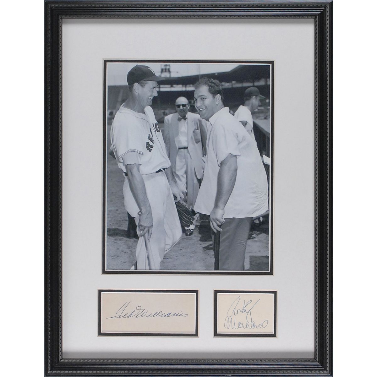 Ballpoint signatures, “Rocky Marciano” and “Ted Williams,” on individual off-white cards, measuring 2.5 x 1.75 and 4.25 x 1.75 respectively. Attractively double-matted and framed with a photo of the two sports legends to an overall size of 13.25 x 17.25. In overall fine condition.