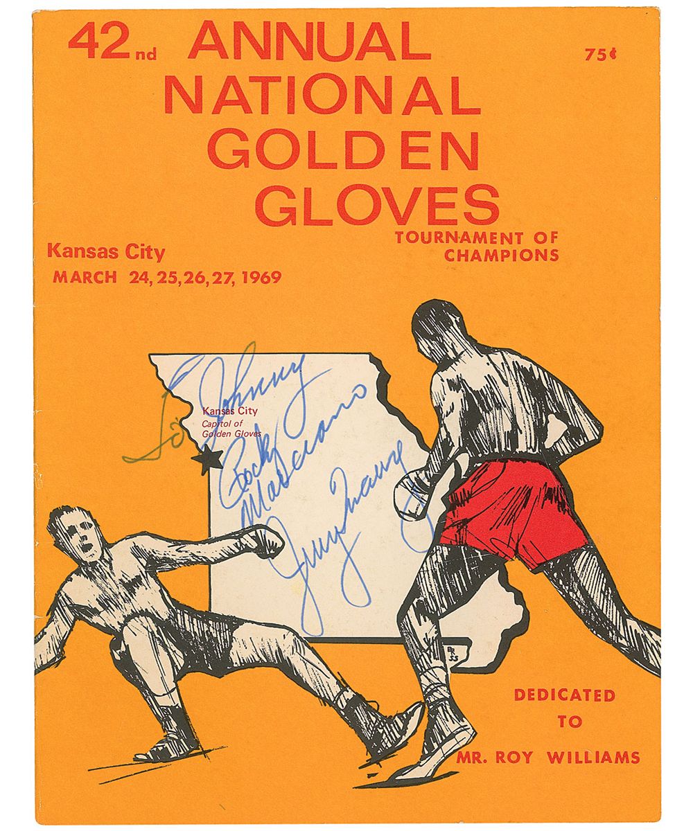 Original program from the 42nd Annual National Golden Gloves Tournament of Champions, held in Kansas City in March of 1969, 8.5 x 11, 24 pages, signed and inscribed in blue felt tip, “To Johnny, Rocky Marciano,” and also signed by Jerry Quarry. In fine condition, with some slight handling wear.