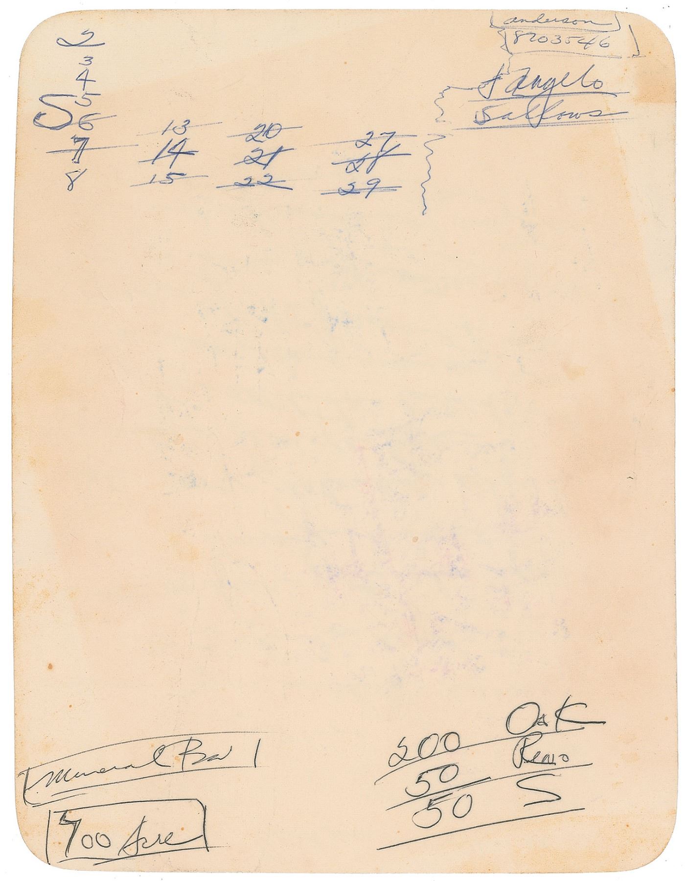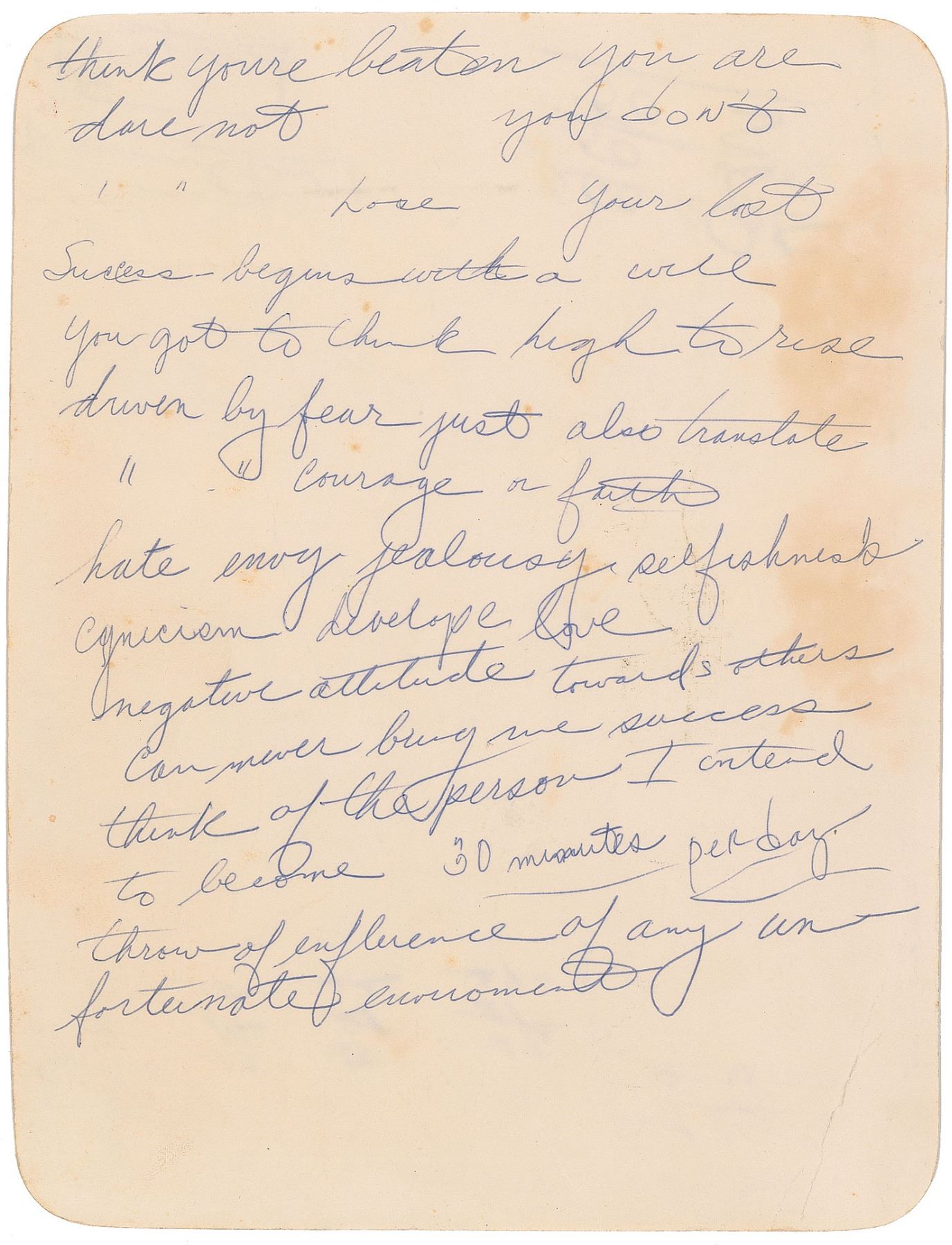 Unsigned handwritten notes by Marciano on an off-white 7 x 9 card, no date. An unusual stream-of-consciousness motivational passage, in full: "think you're beaten you are dare not you don't [dare not] lose your last success begins with a will you got to think high to rise driven by fear just also translate [driven by] courage or faith hate envy jealousy selfishness cynicism develop love negative attitude towards others can never bring me success think of the person I intend to become 30 minutes per day throw of influence of any unfortunate environment." In fine condition, with a crease to the lower right corner, and some light stains to the right side. Accompanied by a full letter of authenticity from PSA/DNA.
