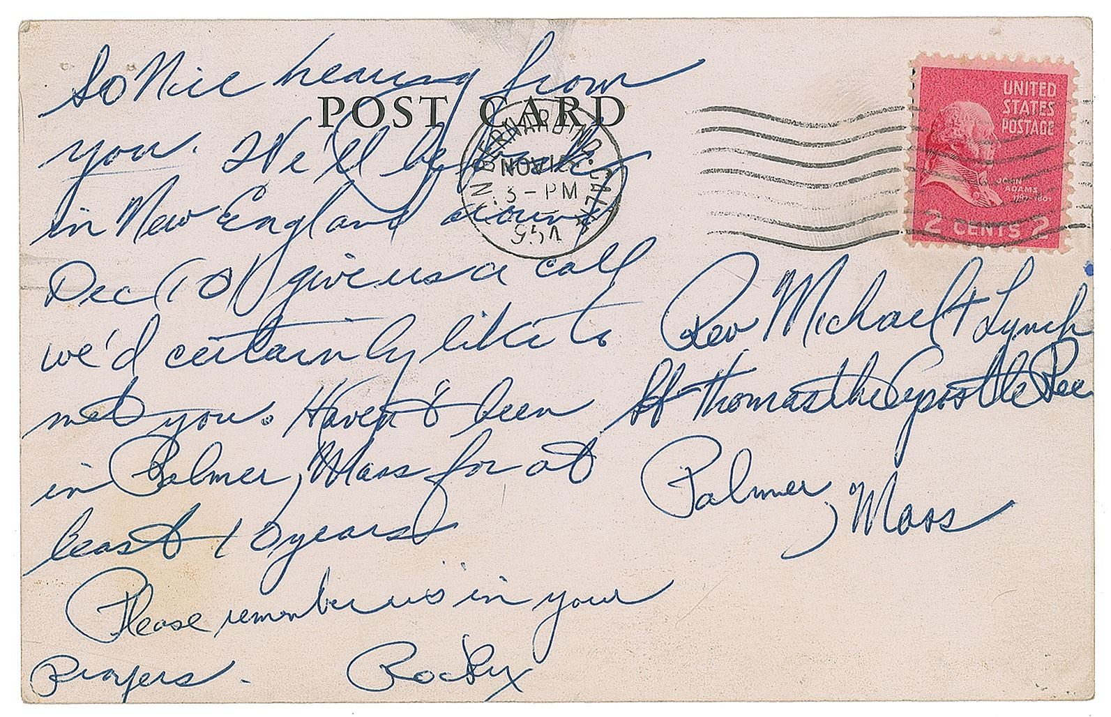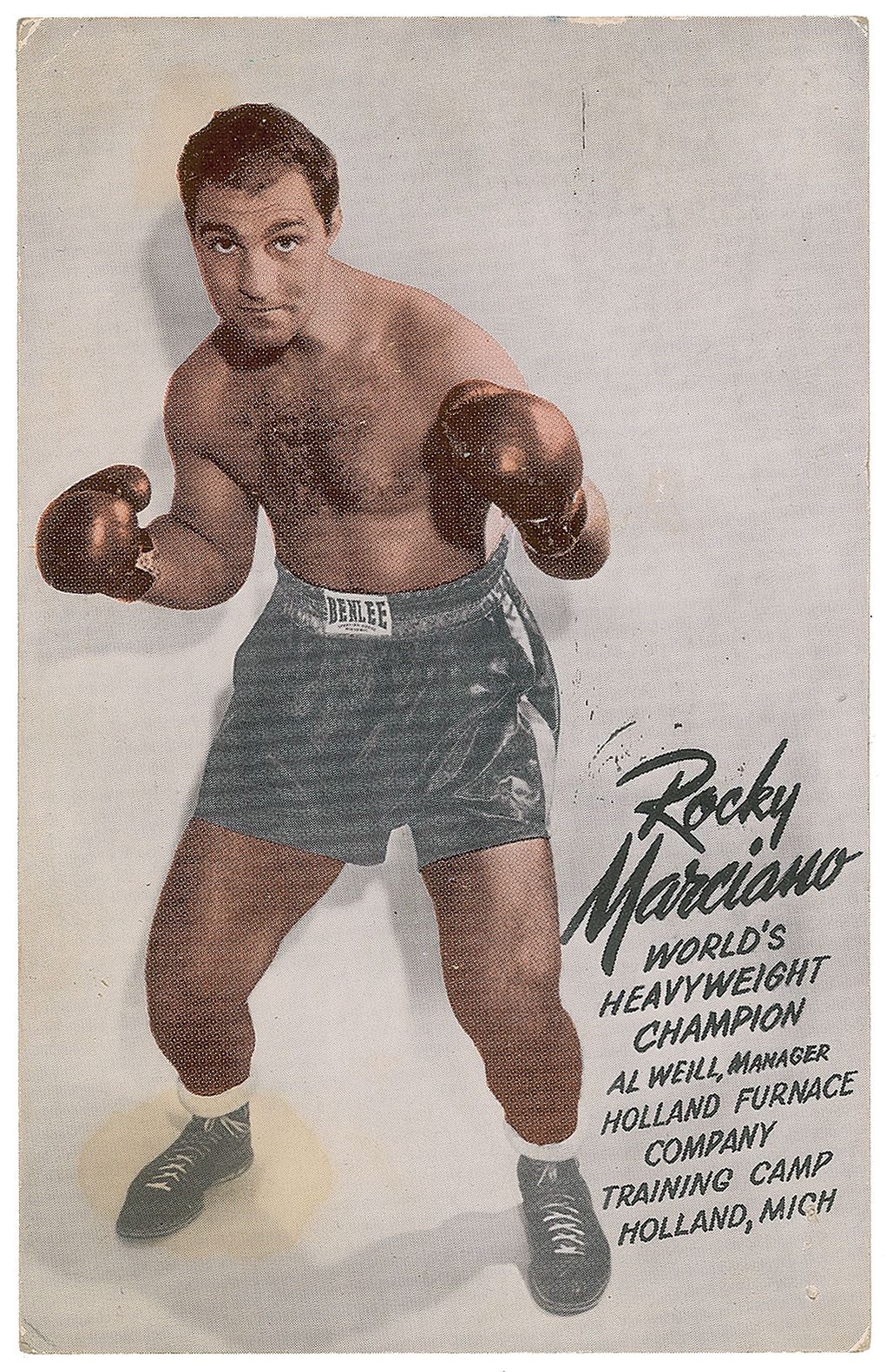 ALS signed “Rocky,” penned in ballpoint on the reverse of a glossy 5.5 x 3.5 postcard showing Marciano in his boxing stance, postmarked November 1954. Letter to Rev. Michael Lynch at St. Thomas the Apostle Rectory in Palmer, Massachusetts, in full: "So nice hearing from you. We'll be back in New England around Dec. 10, give us a call, we'd certainly like to meet you. Haven't been in Palmer, Mass for at least 10 years. Please remember us in your prayers." In fine condition, with a couple of light stains to the photo side. Marciano had defended his title against Ezzard Charles a month earlier with an eighth round knockout, improving the Brockton Blockbuster's record to 47-0.