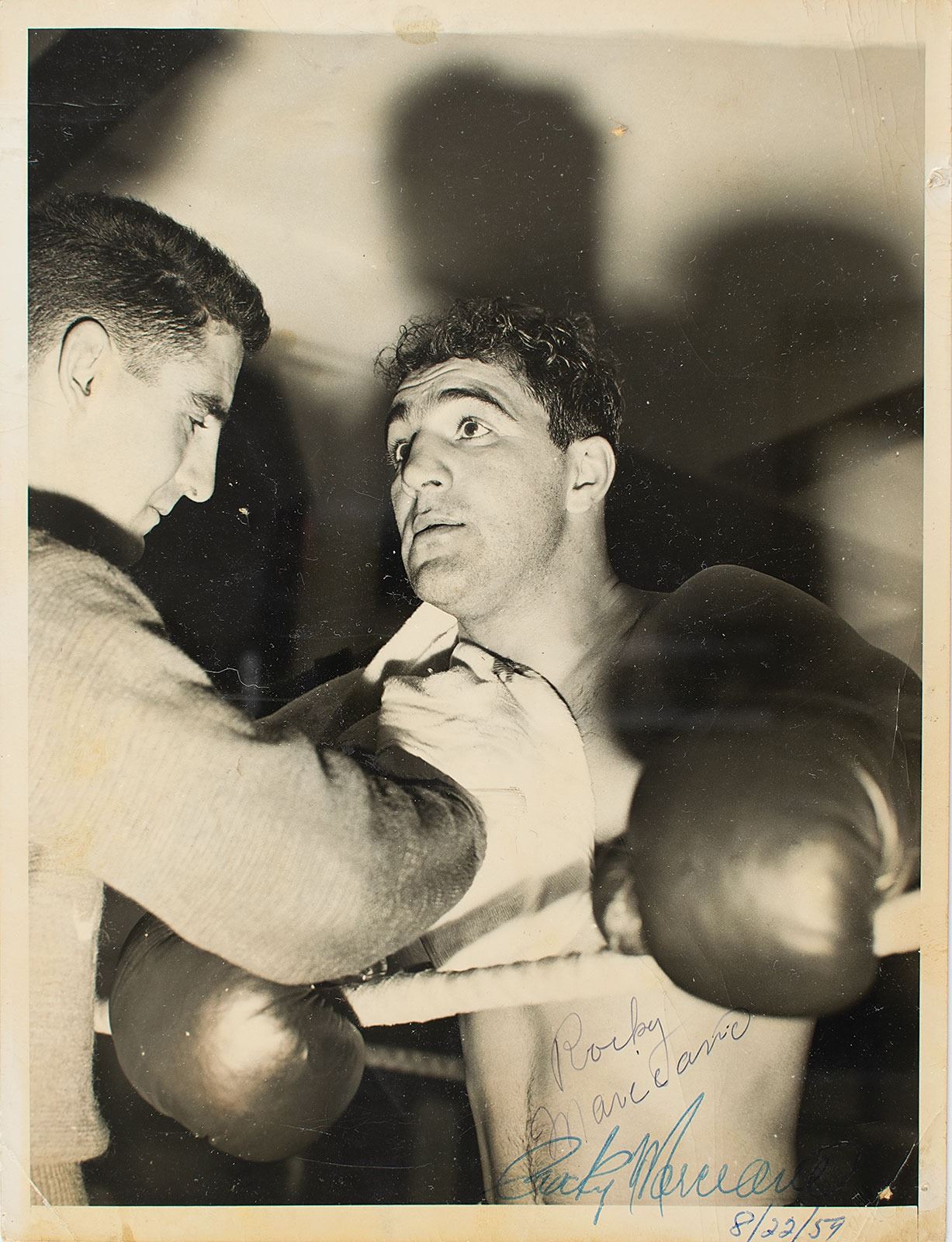 Vintage glossy 7 x 9 photo of Rocky Marciano being tended to during a training session, signed in blue ballpoint. The upper signature and date to border are in an unknown hand. Reverse bears an International News Photo stamp and collector's notations: "Taken 8/22/59 at 2nd St. in Caster's Store, Hbg, Pa." In very good condition, with overall creasing, and bends to the lower corner tips.