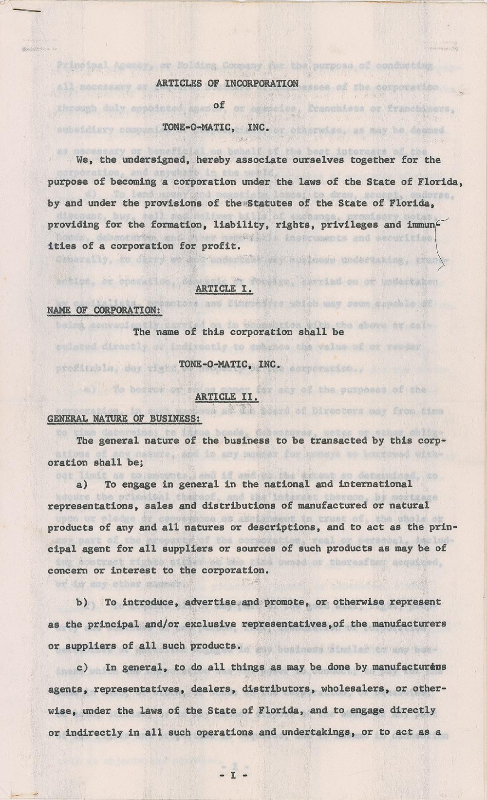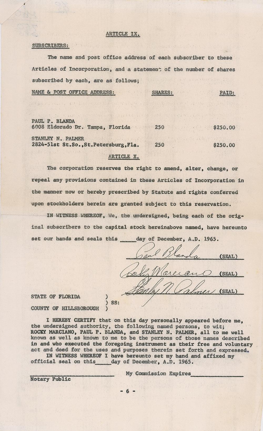 DS, six pages, 8.5 x 14, December 1965. Articles of Incorporation for Tone-O-Matic, Inc., whose nature of the business “shall be to engage in general in the national and international representations, sales and distributions of manufactured or natural products of any and all natures or descriptions, and to act as principal agent for all suppliers or sources of such products as may be of concern or interest to the corporation.” Signed on the final page in black ink by Marciano and his partners Paul Blanda and Stanley Palmer. In fine condition, with a light vertical crease through a single letter of signature, some light creases, and a staple to top left.